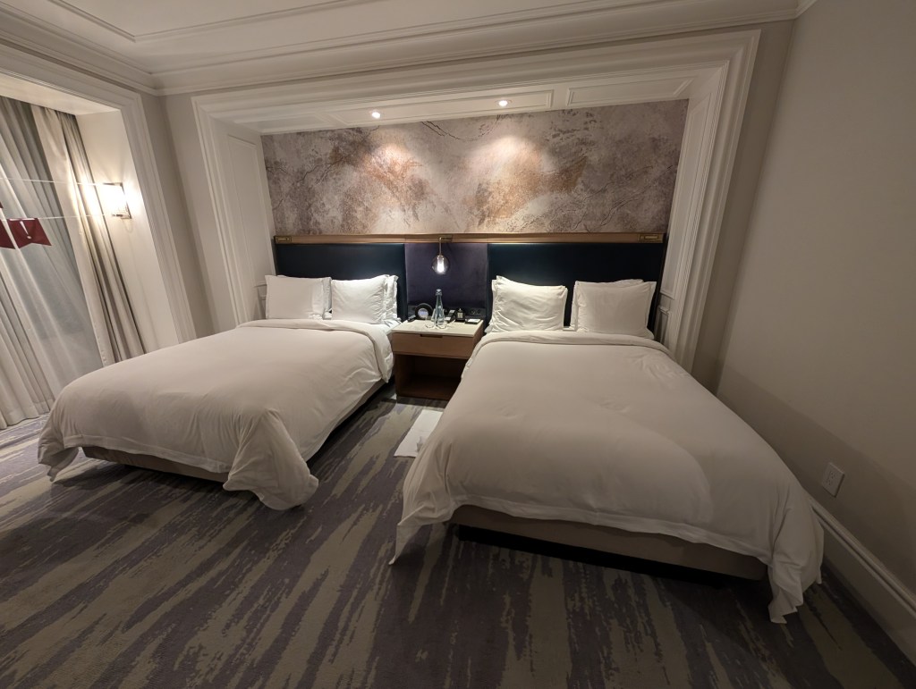 Escortés par le bagagiste, nous nous sommes dirigés vers le 25e étage. Pour ce séjour, j’avais réservé une «Chambre deluxe avec deux lits doubles», le seul type de chambre adapté aux séjours à quatre personnes à part les suites à deux chambres.