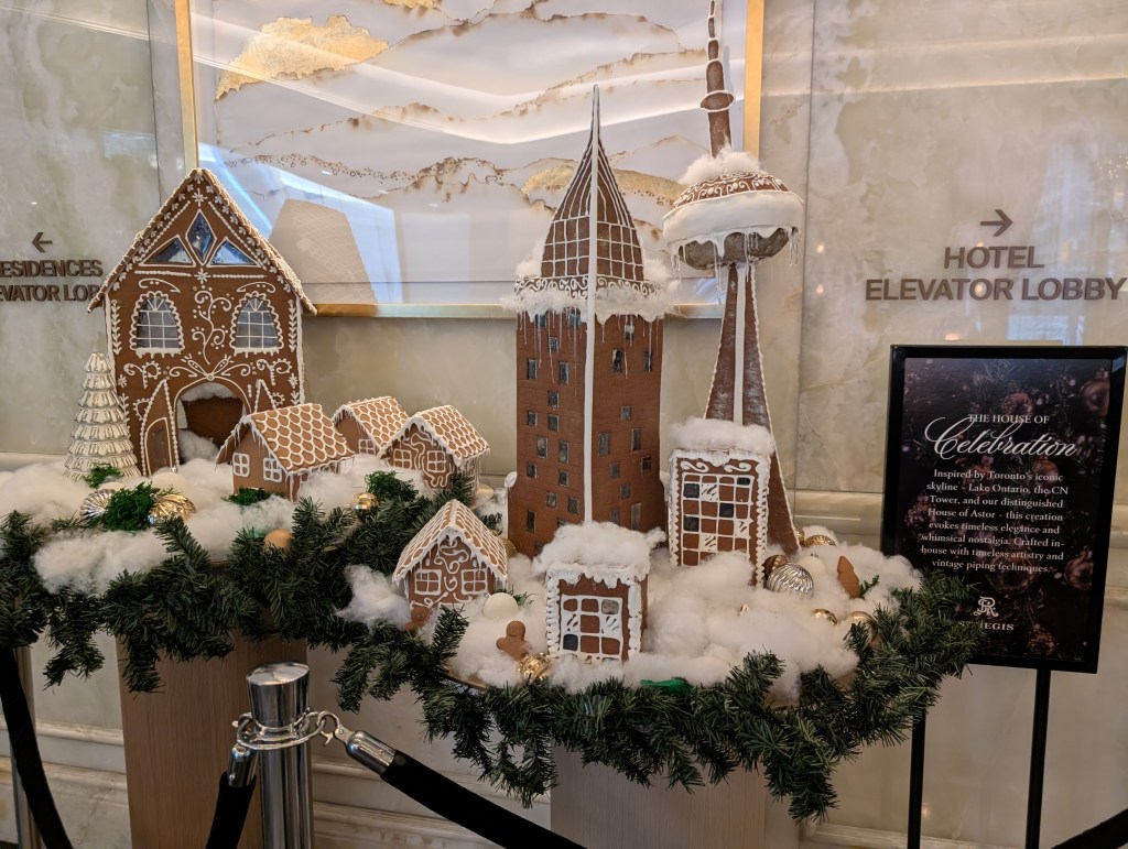 Décoré pour les Fêtes, l’hôtel était magnifique au moment de notre visite. Un beau sapin avec des ornements dorés, de même qu’une boîte à lettres servant à recueillir le courrier du père Noël trônaient dans le hall d’entrée, de même qu’un impressionnant paysage de Toronto en pain d’épice. Même la Tour CN y était! J’avoue m’être demandé, l’espace d’un instant, s’il s’agissait vraiment de pain d’épice.