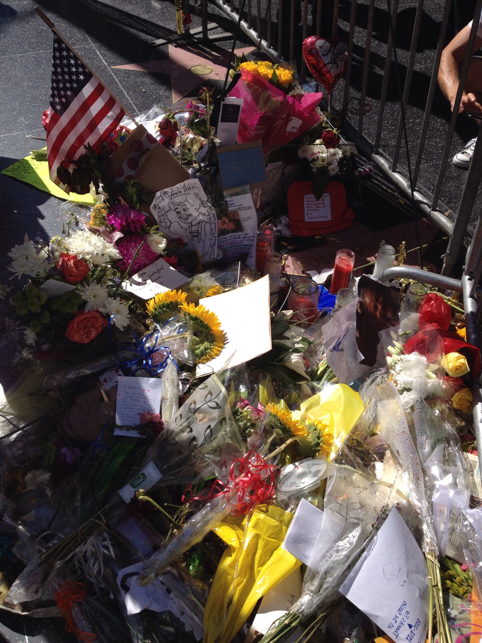 Fleurs, lettres, chandelles… Tout ça déposé sur un petit carré d’Hollywood Boulevard où des dizaines et des dizaines de personnes se recueillent à tour de rôle.