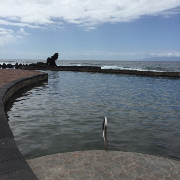 Comme l’océan est trop déchaîné à cet endroit, une piscine a été aménagée directement dans la mer. Une digue a été construite autour et elle se remplie avec l’eau de mer des vagues qui viennent s’y briser.