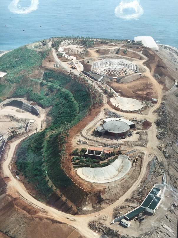 Pourquoi? Parce que la colline en bordure de l’eau sur lequel il a été construit est en fait… une montagne de déchets! Un dépotoir. Vous avez bien lu, jusqu’au début des années 90, Santa Cruz entassait ses déchets à ciel ouvert sur la côte de l’océan Atlantique (!!!). C’est en 1992 que l’idée d’y construire un jardin botanique a germé. Regardez de quoi ça avait l’air en cours de projet.