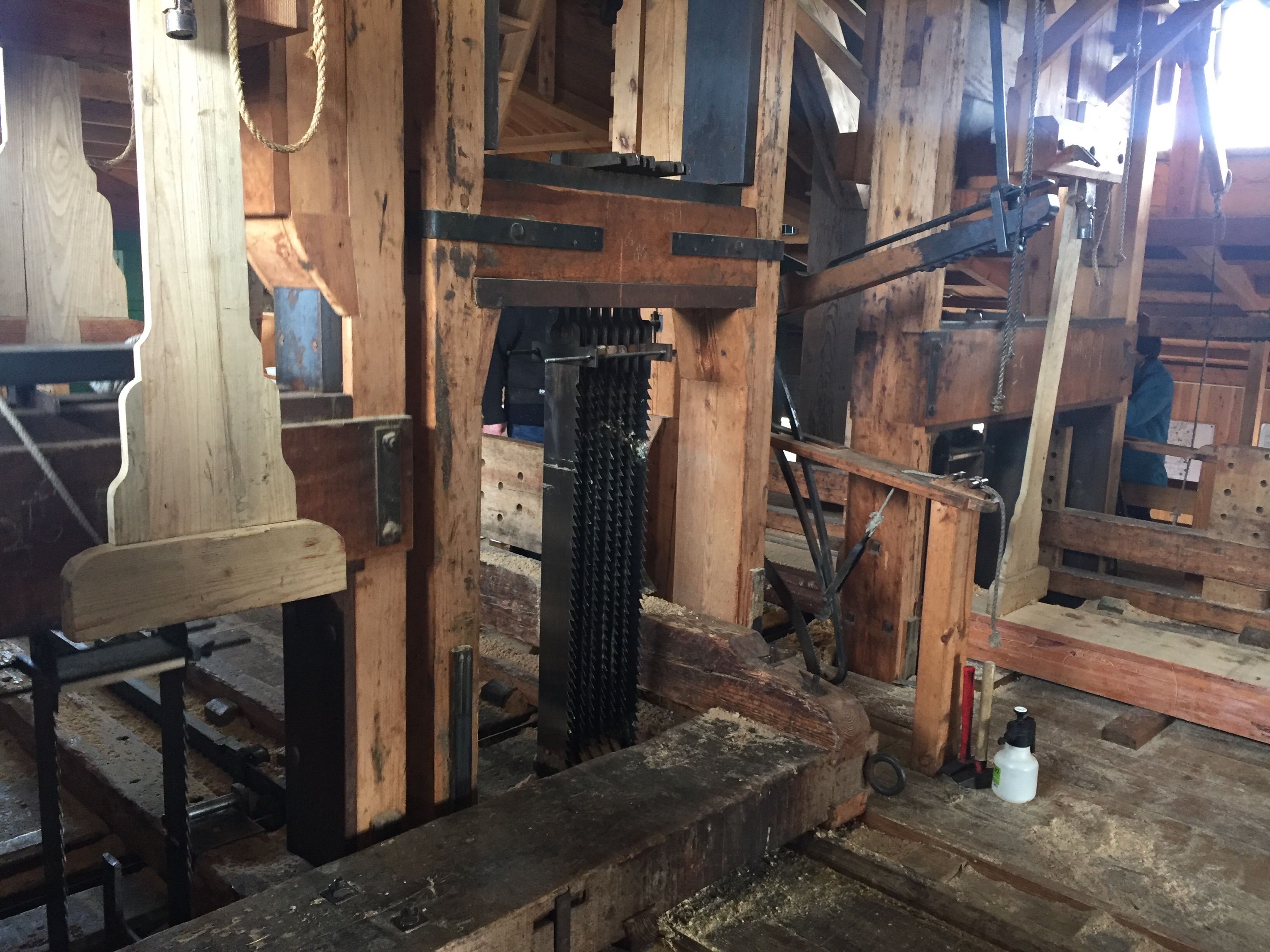 Nous avons appris que les billots de bois doivent tremper dans l’eau pendant au moins un an avant de passer au moulin. La période de trempage permet d’éliminer le suc dont se nourrissent normalement les bactéries qui font pourrir le bois. Une fois cette étape complétée, c’est le vent qui fait entrer le lourd et long billot dans le moulin. Oui, oui! On attache une corde au billot alors que l’autre extrémité est reliée au mécanisme actionné par les pales. Lentement, le morceau est traîné jusqu’à l’intérieur du moulin.