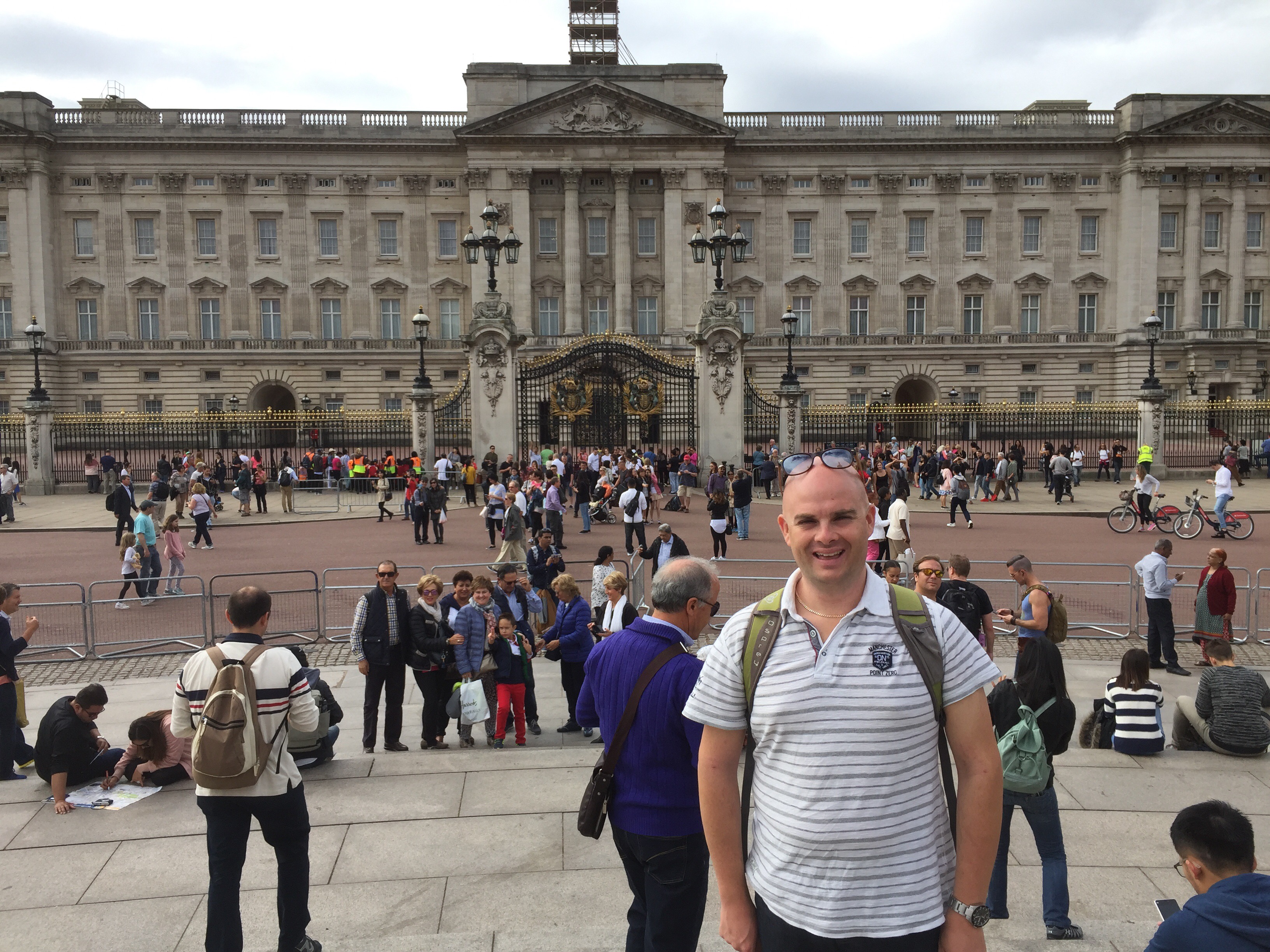 11h30 – On débarque au cœur de Londres juste à temps pour assister au changement de garde au Palais de Buckingham. Du moins, essayer. Il y avait une véritable marée humaine devant la résidence de la reine. On a entendu la musique, mais on a surtout vu des « selfie sticks » se promener au lieu des célèbres gardes vêtus de rouge. On a attendu que les gens se dispersent à la fin de la cérémonie pour avoir au moins la chance d’apercevoir le palais qui est quand même très impressionnant. On se reprendra pour le reste. Par ailleurs, je ne sais pas si la reine était présente puisque ni le drapeau royal ni l’Union Jack ne flottait sur le palais. Mystère!