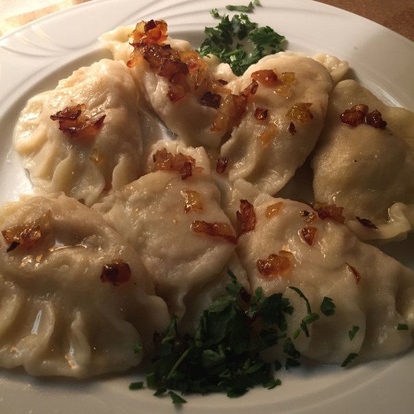 Les pierogis sont des espèces de dumplings, de ravioles, apprêtés de différentes façons. Ce soir, ils étaient farcis de patates pilées, de bacon fumé et de fromage à la crème avec de petits morceaux d’oignon sur le dessus.