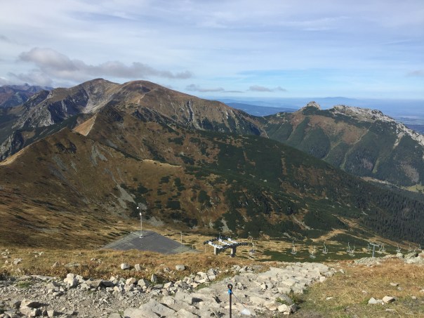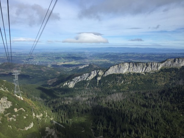 C’est dans cette petite ville tout à fait charmante qu’on monte à bord des grandes cabines du téléférique qui nous mènera ensuite au sommet du Kasprowy Wierch, à 1987 mètres d’altitude. Tout cela se fait en deux étapes totalisant une dizaine de minutes: une première montée, on change de cabine, puis on file au sommet à bord d’un second téléférique.