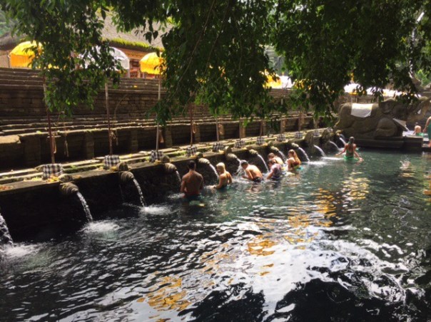 Convenablement vêtus, donc, les Balinais (et autres personnes qui veulent participer) entrent dans les grands bassins et passent ensuite par chacune des fontaines en se mouillant la tête et le visage. À ce qu’on dit, l’eau de la source sacrée aurait même des vertus de guérison.