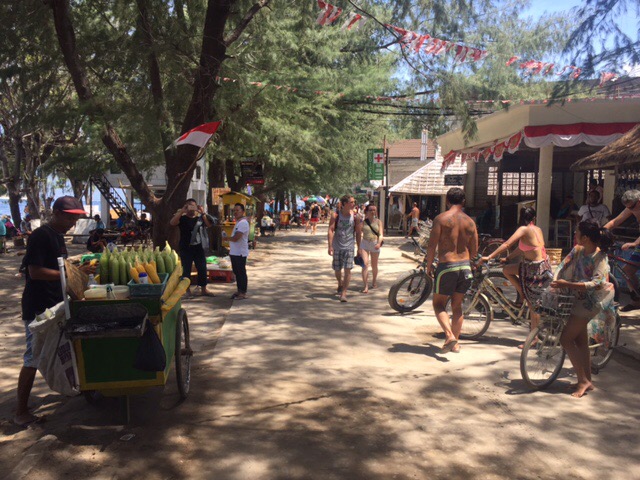 Cinq minutes plus tard, on est déjà sur Trawangan. Il y a de l’action ici! « On dirait Old Orchard sur l’acide », que j’ai dit à l’Amoureuse tellement ça en est étourdissant. La « rue » principale (comme à Gili Meno, il n’y a pas de véhicule motorisé) est un enchaînement de restaurants qui jouent de la grosse musique, d’autres commerces et de vendeurs ambulants dans laquelle on se fait sans cesse couper par les cyclistes et les « calèches taxi » qui actionnent leur klaxon qui sonne « tassez-vous du chemin ». Beaucoup de stimulation!