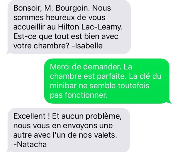 Le samedi midi, un autre texto, cette fois pour nous demander comment se déroule notre séjour jusqu’à maintenant sur une échelle de 1 à 10. Cette façon de faire est grandement appréciée: l’hôtel s’informe sans nous déranger en appelant à la chambre, par exemple.
