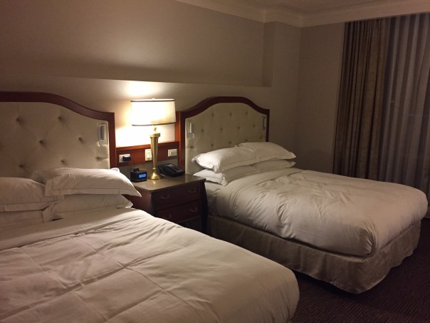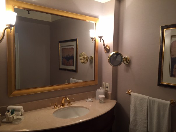 Étant donné la disponibilité des chambres et les prix qui y sont associés, j’ai choisi une chambre avec deux grands lits (on est comme ça, nous: on se sert toujours du deuxième pour mettre valises et vêtements plutôt que d’utiliser la penderie et les tiroirs) et vue sur le lac. La chambre est équipée de deux téléphones, d’un réveil-matin avec socle pour iPhone, d’un téléviseur à écran plat, d’un mini-bar complet et d’une cafetière. La salle de bain, elle, est en marbre et équipée d’un bain-douche.