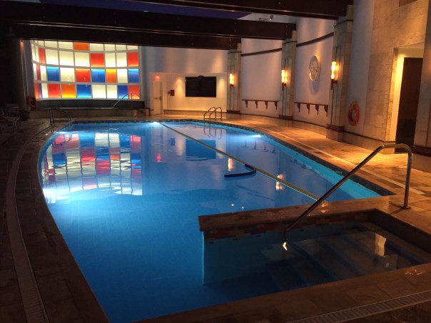 Quant aux installations, nous avons profité des piscines intérieure et extérieure chauffées, de même que du bain à remous intérieur et du sauna sec. On apprécie particulièrement de pouvoir se baigner dans la piscine extérieure sans geler: on y entre de l’intérieur de l’hôtel par un petit portillon (voyez la vidéo sur la page Facebook Hugo autour du monde). Il manquait toutefois de chaises autour de la piscine.