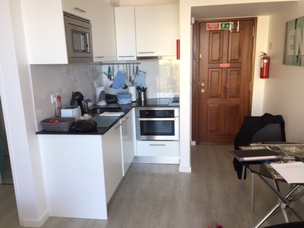 Nous avons donc un studio avec cuisine complète (petit réfrigérateur, four, plaque à cuisson, four à micro-ondes), coin salon, grand lit, salle de bain avec douche et laveuse et… balcon donnant sur l’océan à seulement quelques dizaines de mètres de chez nous.