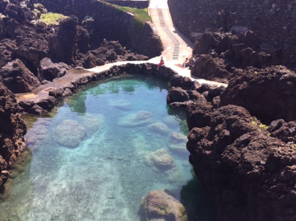 Mais encore mieux, vous pouvez aller à Porto Moniz, au nord-ouest de l’île, où il y a de magnifiques piscines naturelles. C’est ce que l’Amoureuse et moi avons fait aujourd’hui. Ne reculant devant rien (!), nous avons fait 3h30 d’autobus pour nous y rendre et j’étais très excité à l’idée de la belle journée qui nous attendait. Alors qu’on était encore à quelques kilomètres, je me sentais comme un enfant impatient dans l’autobus. Maintenant, imaginez la face que j’ai fait quand nous sommes arrivés, que j’ai vu qu’il n’y avait personne dans les piscines et que j’ai vu l’affiche « CLOSED » dans la fenêtre de la billetterie. NON! Je n’ai qu’une seule question pour la femme assise de l’autre côté de la vitrine: « Why? ». « Because the water », dit-elle en faisant de grands signes avec les mains.