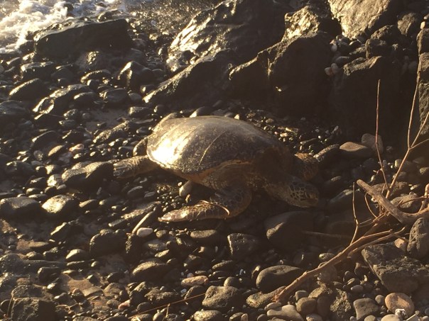 De retour à notre hébergement, on s’est installés sur la terrasse du deuxième étage pour déguster le cocktail du jour de notre hôte Stephen (qui a fait notre lessive gratuitement aujourd’hui!), lorsque ce dernier nous a invités à aller voir avec lui s’il y avait des tortues sur la plage de l’autre côté de la rue. Non seulement nous en avons vu plusieurs en train de nager près de la rive, mais il y en avait une énorme qui prenait du soleil sur les rochers. C’était fascinant, je n’avais eu la chance de voir une tortue de mer! Quel beau spectacle!!