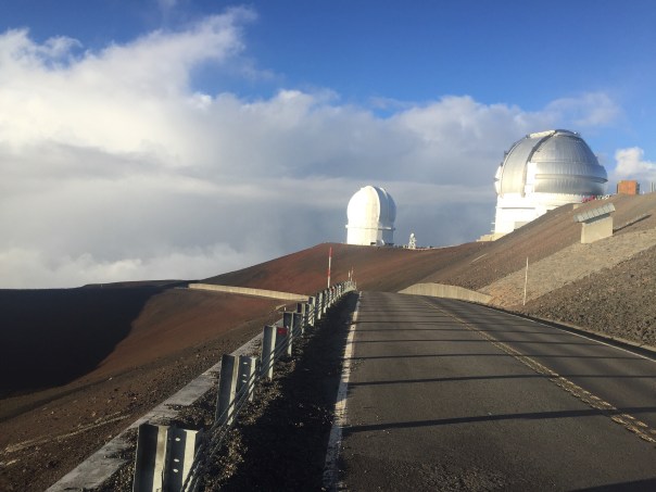 Il nous faut finalement 35 minutes pour atteindre le sommet du Mauna Kea. On aperçoit alors ces dômes argentés, les observatoires d’astronomie que plusieurs pays ont installés ici, car c’est un endroit privilégié pour étudier l’espace. Des touristes asiatiques portent tous les mêmes manteaux / pantalons qu’on leur a fournis pour les protéger du froid. Décidément, on se croirait dans une colonie extraterrestre.