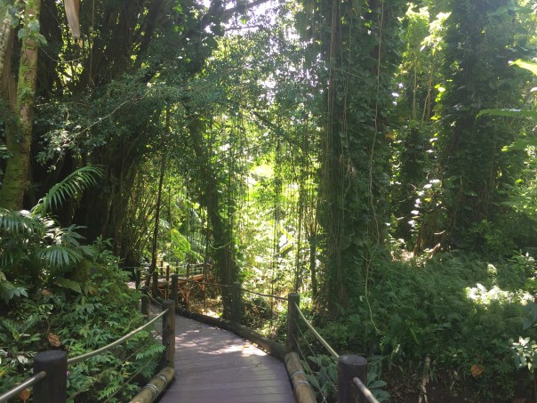On dénombre aujourd’hui plus de 2000 espèces dans un décor pour le moins enchanteur alors qu’on y trouve un petit lac artificiel, des chutes et une partie a même été aménagée en bordure de l’océan. J’ai bien apprécié le jardin d’orchidées, mais surtout l’entrée du site principal où une longue promenade nous fait descendre dans la vallée alors que nous sommes entourés d’une végétation luxuriante. On se croirait presque sur un pont suspendu au milieu de la jungle.