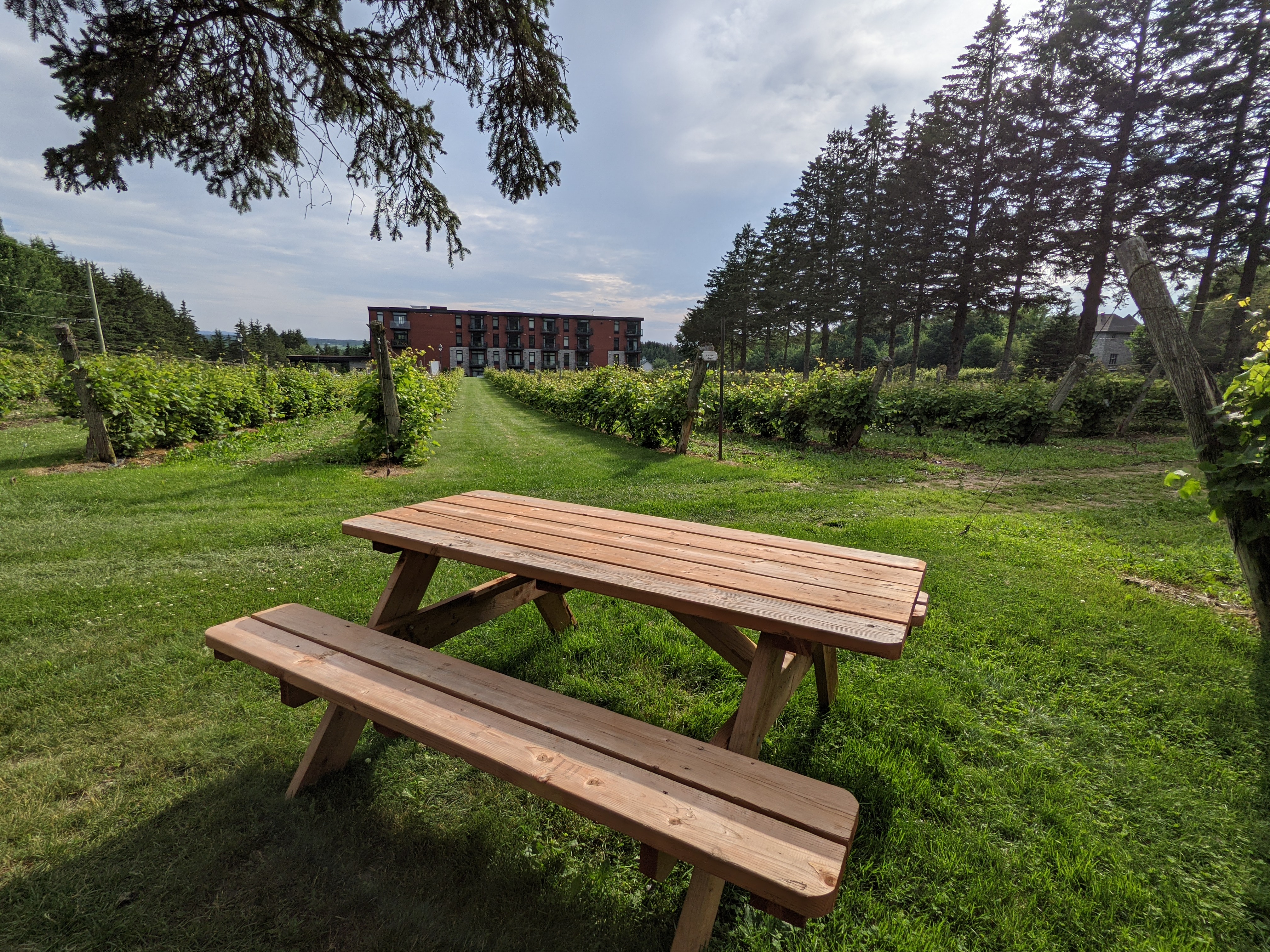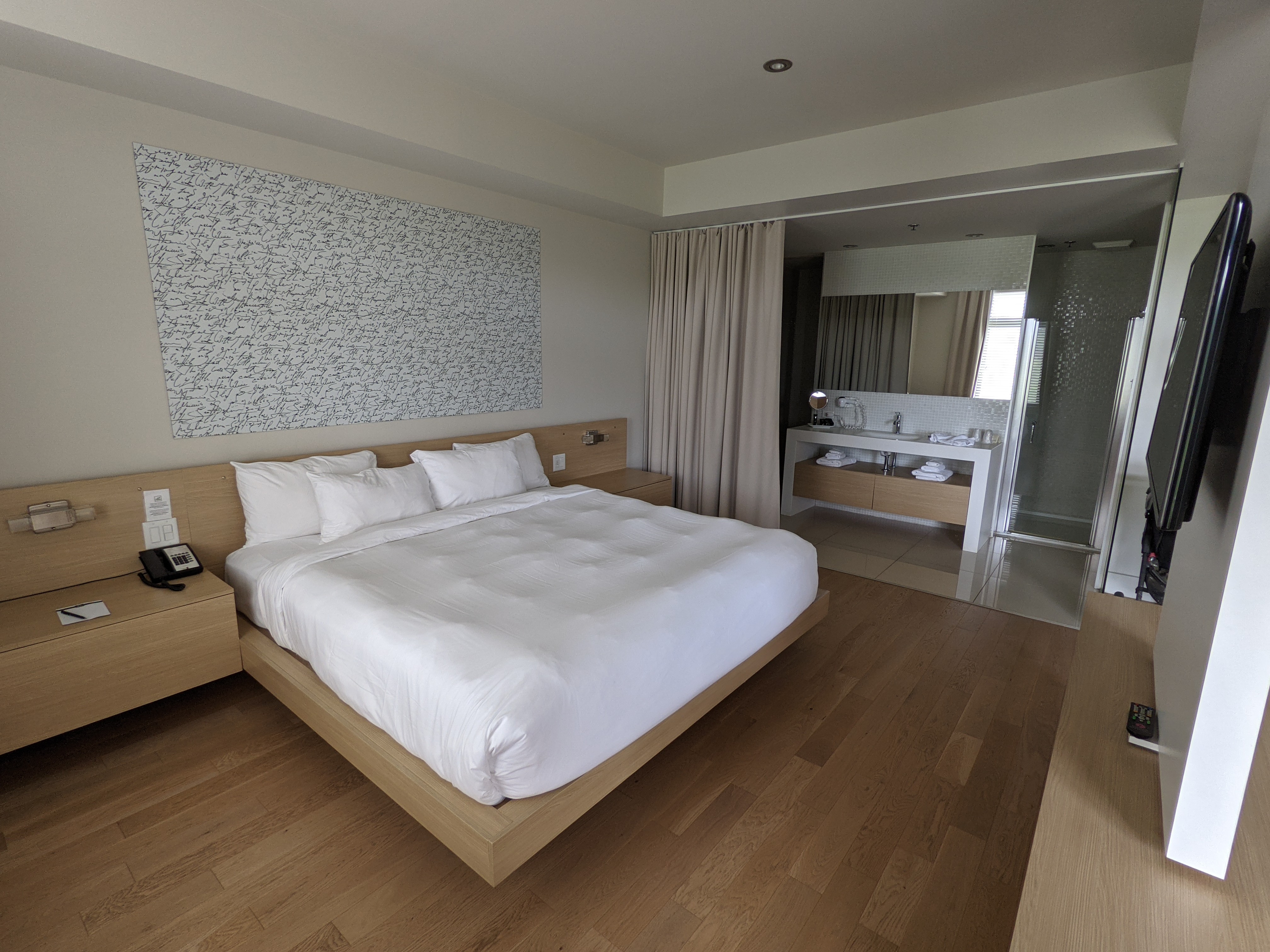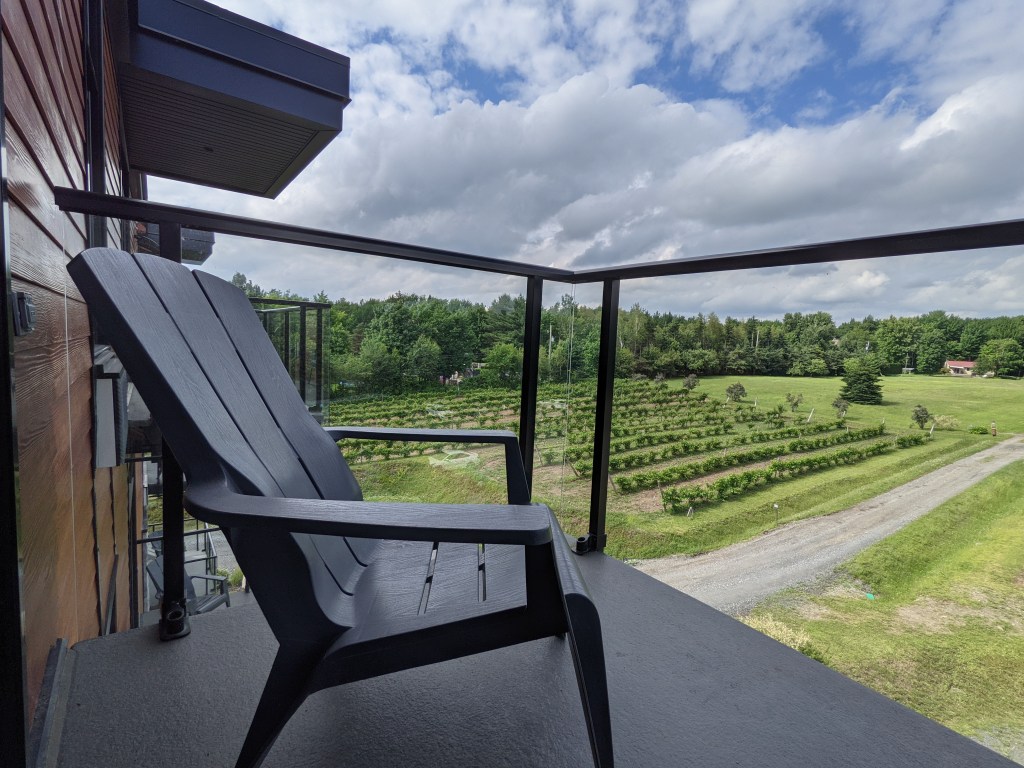 Nous attendait une spacieuse suite de 500 pi2 comprenant un lit king, une salle de bain avec douche, un sofa, un espace de travail un petit réfrigérateur, une cafetière Nespresso et un balcon sur lequel se trouvait deux chaises avec une belle vue sur le vignoble qui se trouve à quelques pas de l’hôtel. Petite déception: un simple store à lattes horizontales habillait la fenêtre à côté du lit laissant entrer beaucoup de lumière tôt le matin.