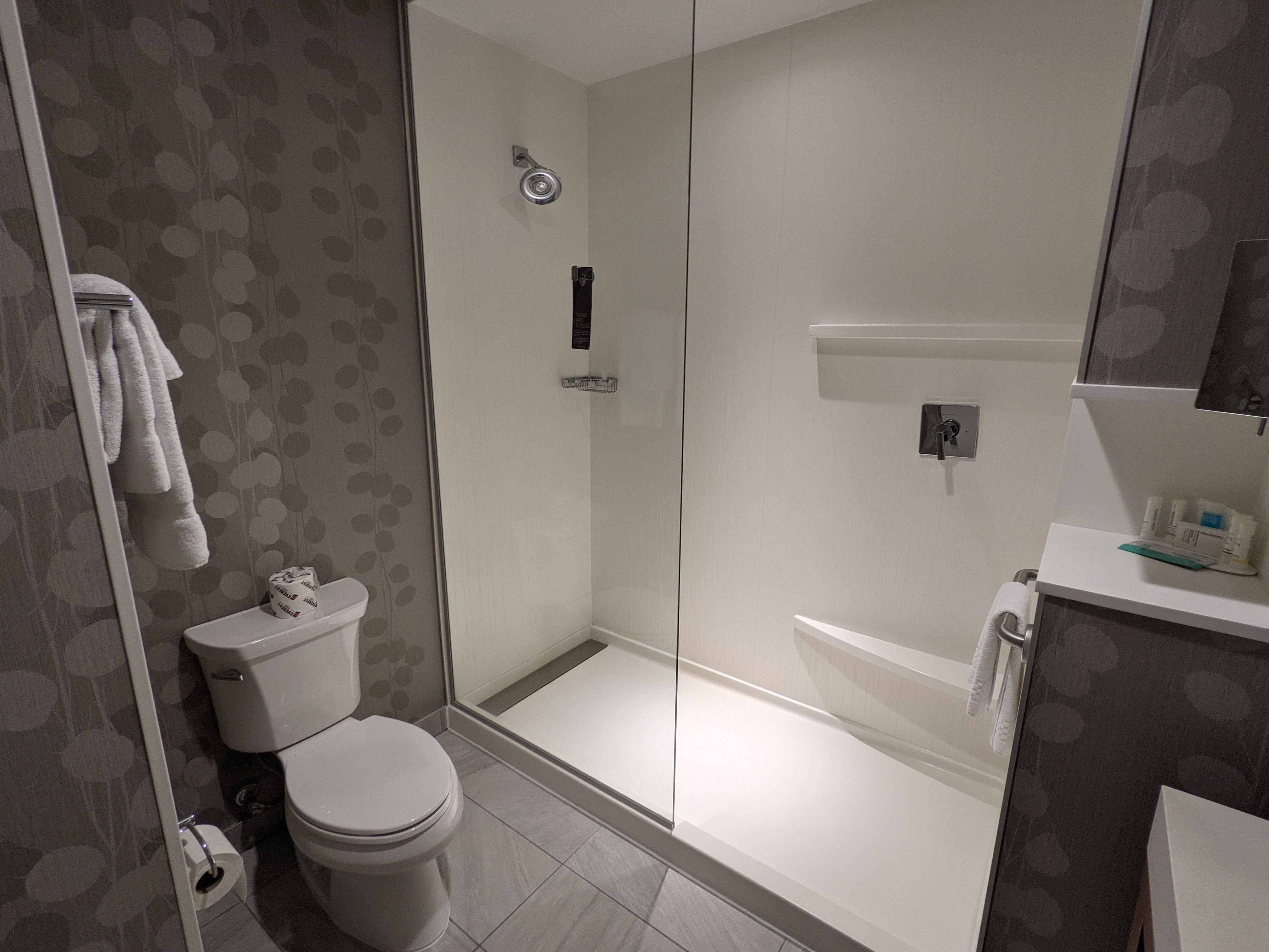 Parmi les autres aménagements de la chambre: une grande salle de bain avec douche, une télévision intelligente (avec possibilité de se connecter à Netflix, par exemple), un petit réfrigérateur et un four à micro-ondes. Les tables de chevet, situées de part et d’autre du lit, étaient munies de prises électriques et USB permettant de recharger les appareils électroniques pendant la nuit. Le lit et le canapé-lit étaient tous les deux très confortables. Même si la vue n’était pas extraordinaire, j’ai apprécié la généreuse fenestration allant du plancher au plafond. Autre point fort: de l’eau chaude instantanément dans la salle de bain.
