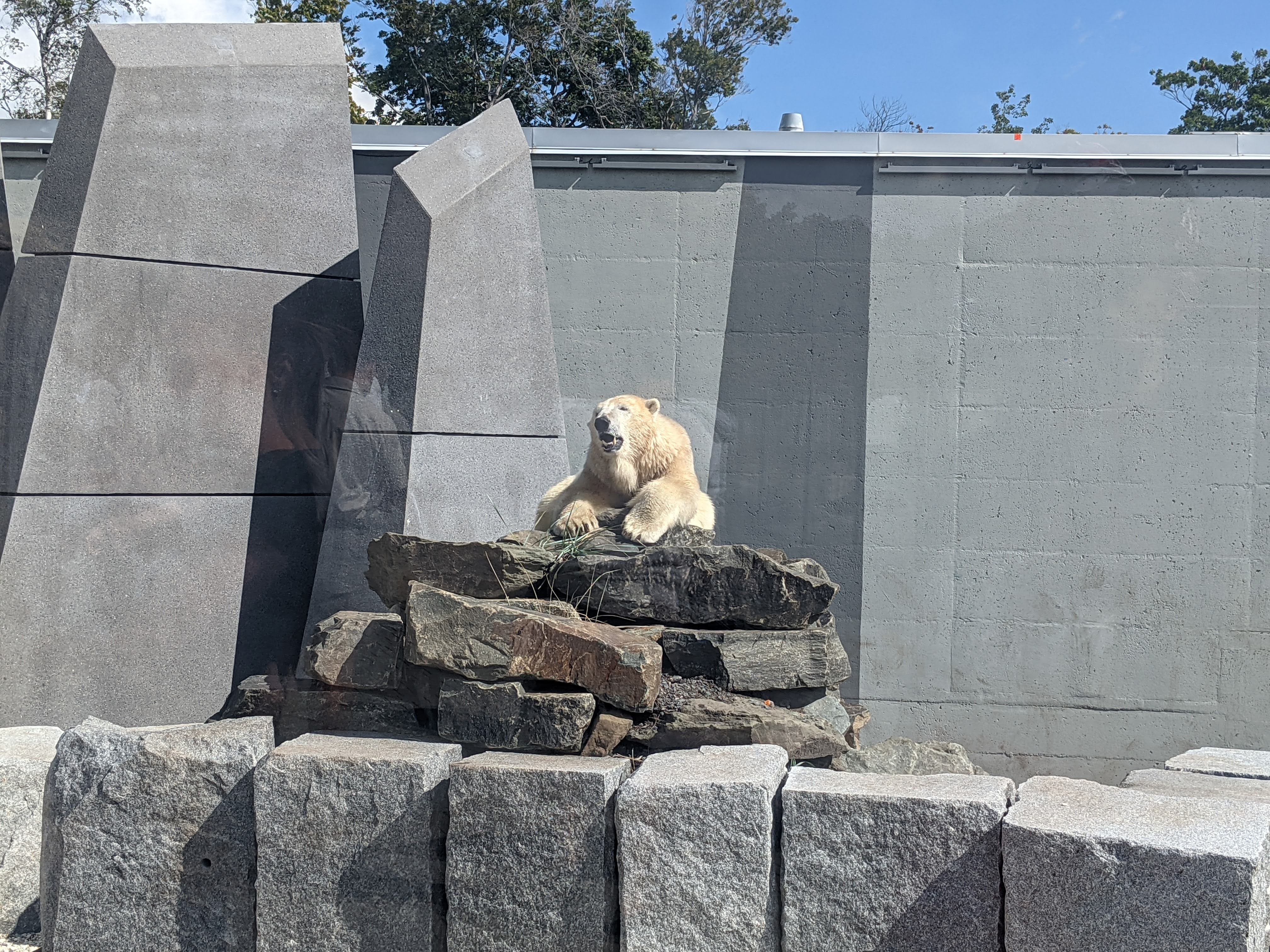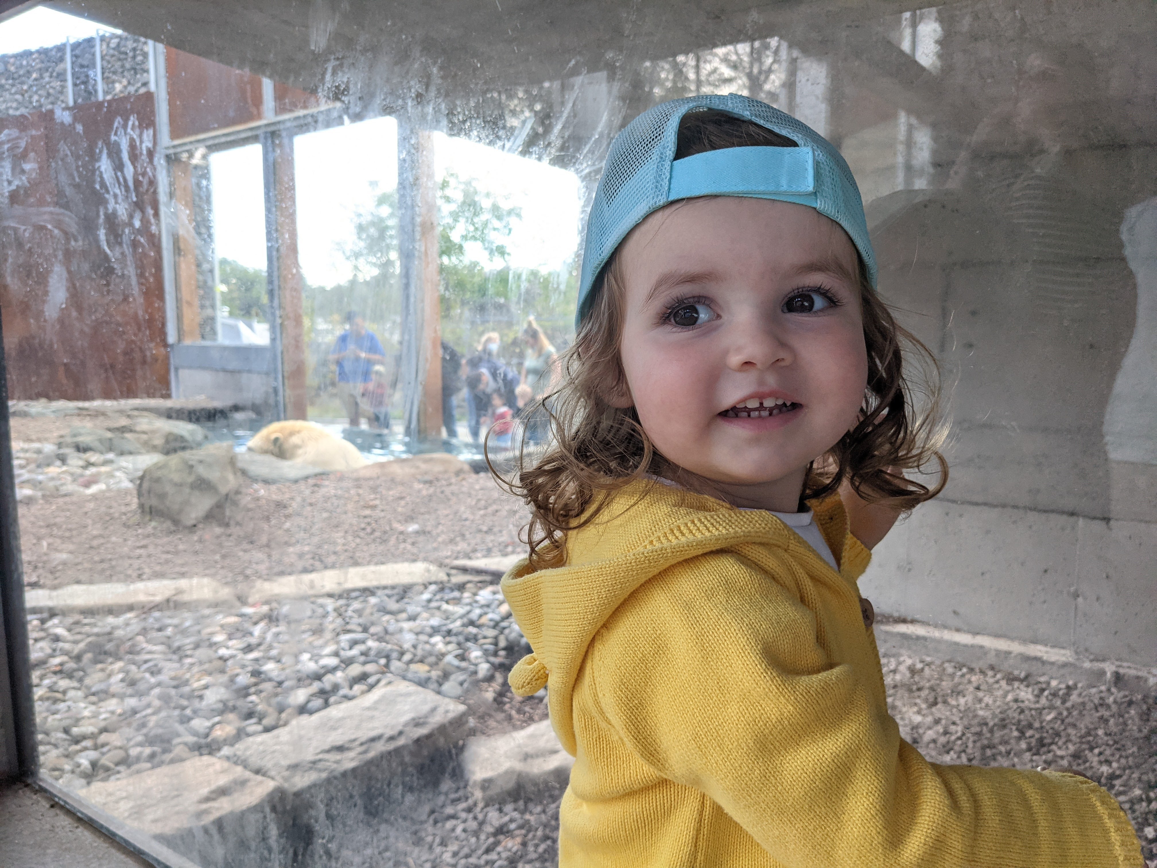 Nous avons terminé notre séjour par une visite à l’Aquarium du Québec, où je n’avais pas mis les pieds depuis que j’étais enfant, si bien que mes souvenirs en étaient très flous. Ici aussi, il a fallu réserver une plage horaire à l’avance pour nous assurer de pouvoir visiter les lieux. Nous avons été enchantés par notre visite et nous avons été particulièrement impressionnés par les animaux en espace extérieur: les ours polaires (dont l’un prenait fièrement la pose pendant que l’autre s’amusait dans l’eau avec un bac de recyclage), les gigantesques morses et les jolis phoques que notre petite fille pointait en disant «veut flatter» (comme tous les autres animaux, y compris le dindon sauvage qui nous visite quotidiennement à la maison).