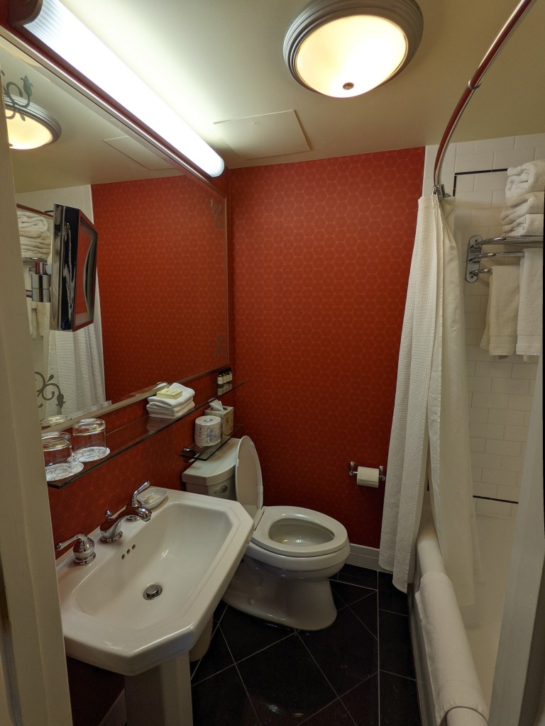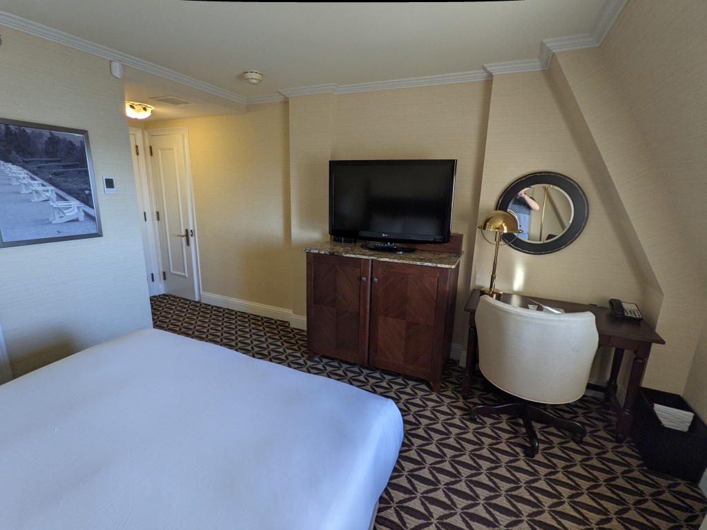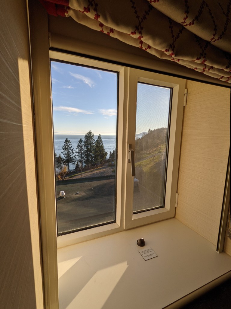Probablement en raison du moins grand achalandage à cette période de l’année, j’ai eu droit à une chambre offrant une vue sur le fleuve Saint-Laurent (je ne m’attendais pas à cela, considérant que les nuitées étaient gratuites). Pour le reste, il s’agissait d’une chambre somme toute classique: un grand lit («queen»), un bureau de travail, un fauteuil une place ainsi que deux tables de chevet; l’une d’elles étant munie de prises électrique et USB. La chambre était de dimension standard, mais la salle de bain, avec son bain-douche, était pour sa part minuscule.