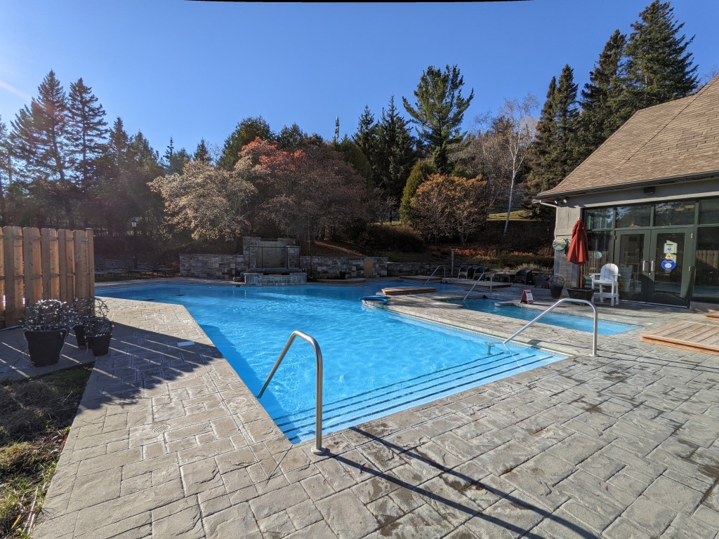L’hôtel est doté d’une piscine intérieure et extérieure. Considérant la température, j’ai préféré opter pour la piscine et le bain à remous extérieurs, tous les deux chauffés. Lors de mon passage, en début d’après-midi, j’étais d’ailleurs le seul client à en profiter.