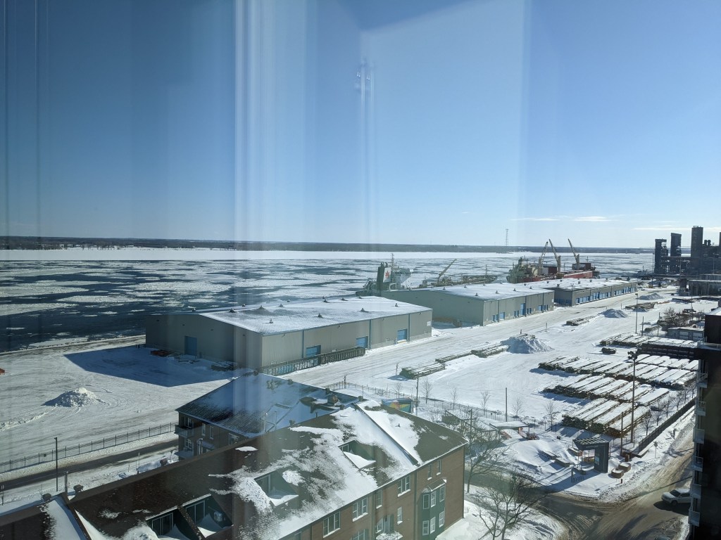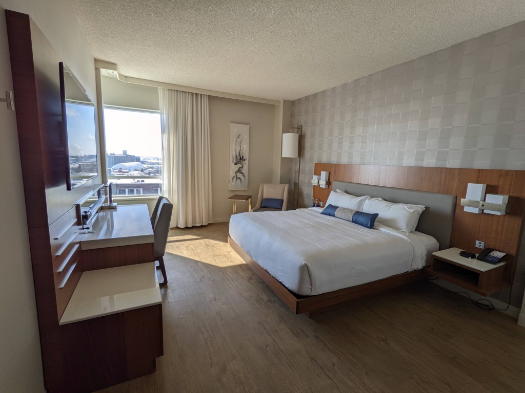 Autre avantage de mon statut Marriott BonVoy: nous avons été surclassés. Alors que j’avais réservé une chambre de base avec un très grand lit, on nous a octroyé une chambre deluxe avec très grand lit et vue sur le fleuve, au 12e et dernier étage de l’hôtel.
