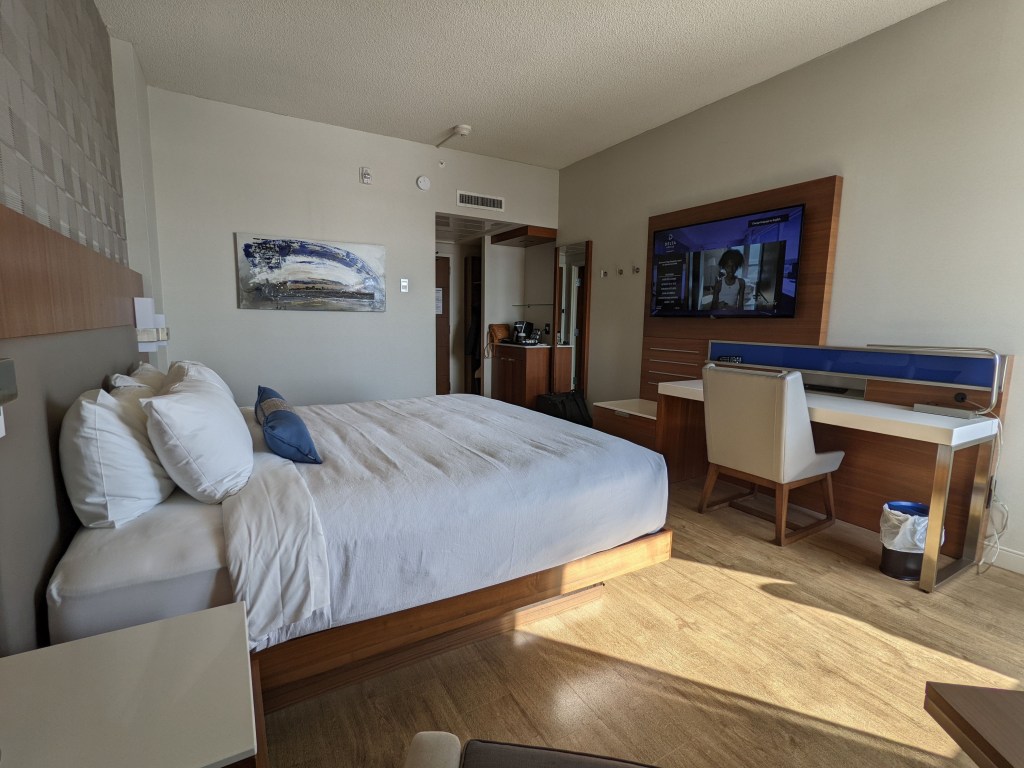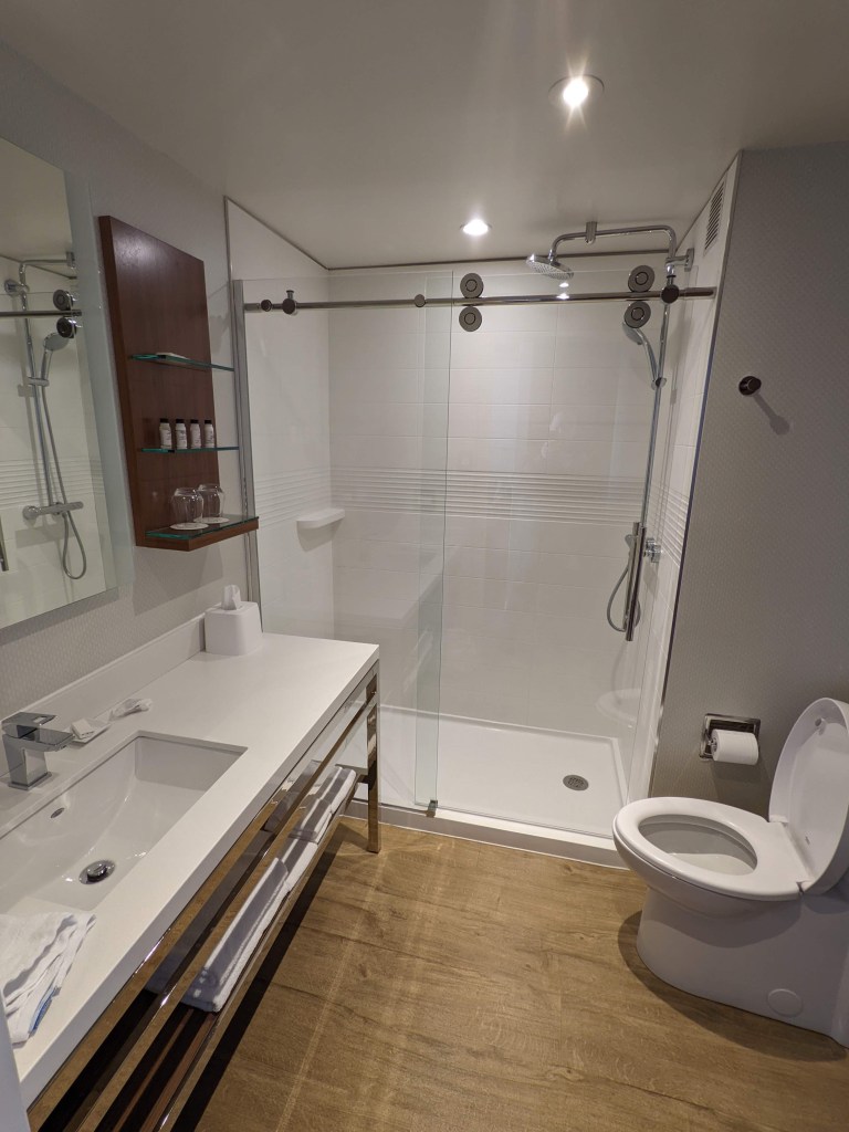En déverrouillant la porte, nous avons découvert une chambre de grande dimension dont les fenêtres donnaient sur deux faces. La chambre était composée d’un lit «king», d’un divan une place, d’un bureau de travail avec plusieurs prises, d’un téléviseur intelligent et d’une cafetière Keurig avec plusieurs choix de boissons (cafés, thés et chocolat chaud). Les tables de chevet étaient toutes les deux équipées de prises électriques et de prises USB et deux bouteilles d’eau offertes par l’hôtel se trouvaient sur l’une d’elles.