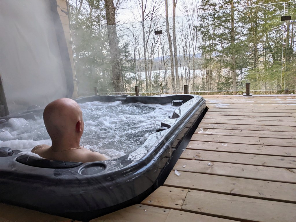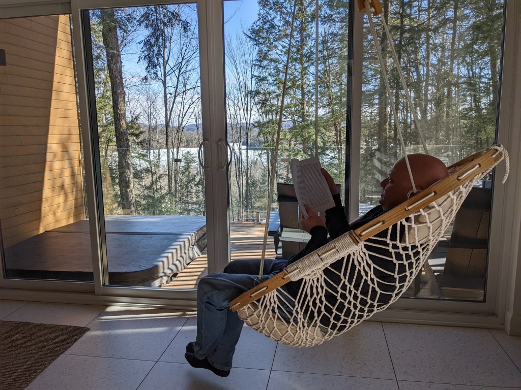 J’en ai profité pour lire (j’étais d’ailleurs très confortable dans le hamac avec vue sur l’extérieur), profiter du spa et nous avons joué à des jeux de société. Nous avions aussi amené tout le nécessaire pour nous faire un bon souper fondue en tête à tête.