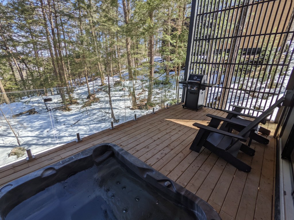 La terrasse est pour sa part équipée d’un spa, de deux chaises Adirondack et d’un barbecue au propane. Les garde-corps en verre permettent d’oublier leur existence et d’admirer la vue sur le lac que l’on soit confortablement installé dans le spa ou même à l’intérieur du chalet.