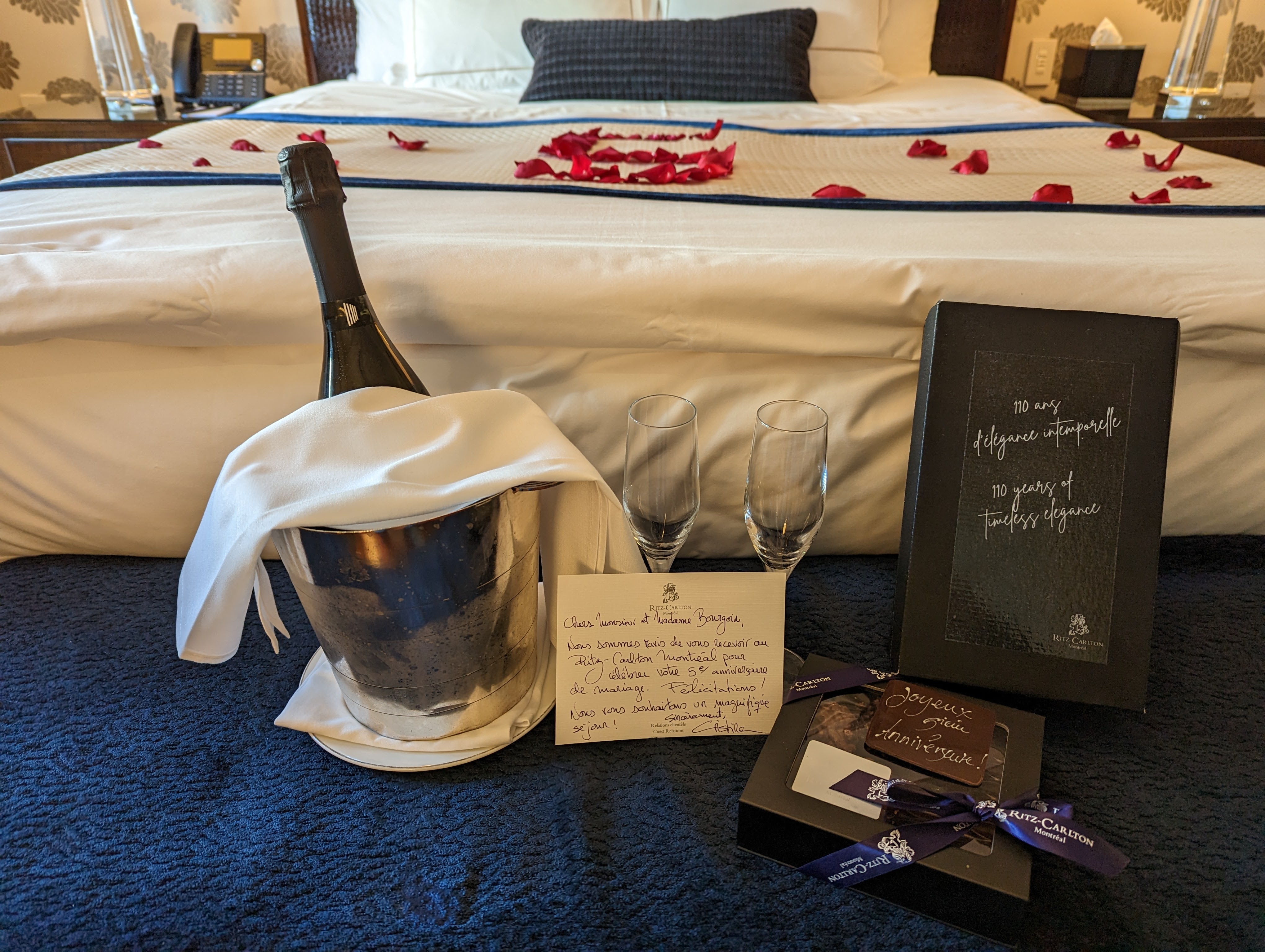 Nous avons par ailleurs eu la surprise de trouver une série de petites attentions de l’hôtel pour souligner notre 5e anniversaire de mariage. Une carte, une bouteille de Prosecco bien froide et une boîte de gourmandises (biscuits et chocolats) avaient été déposées sur le meuble de l’entrée et le chiffre «5» était dessiné avec des pétales de rose sur le lit. L’hôtel nous a aussi offert, dans un coffret 110e anniversaire, deux flûtes en verre à l’effigie du Ritz-Carlton. On ne pouvait demander mieux comme accueil!