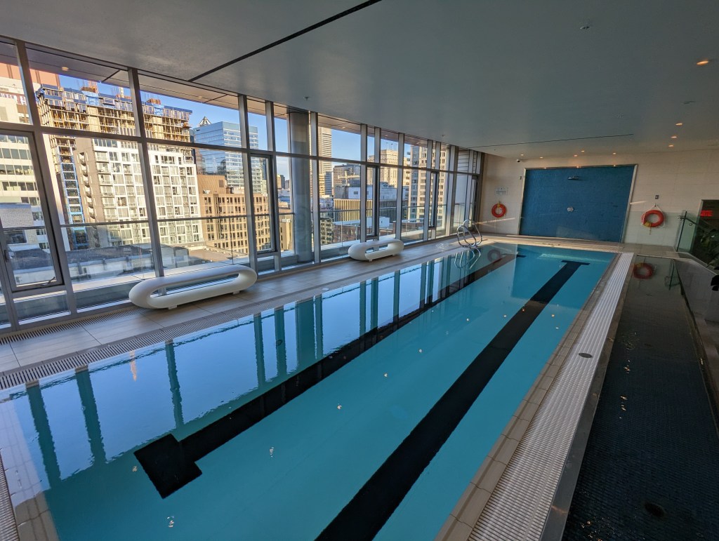 Vêtus du confortable peignoir de l’hôtel, nous sommes ensuite allés au 12e et dernier étage de l’hôtel pour profiter de la piscine intérieure. Nous avons tout de suite été charmés par l’endroit: une piscine à débordement avec vue sur le centre-ville dans une salle décorée de palmiers, avec foyer au gaz, où se trouvent également plusieurs chaises longues et divans.