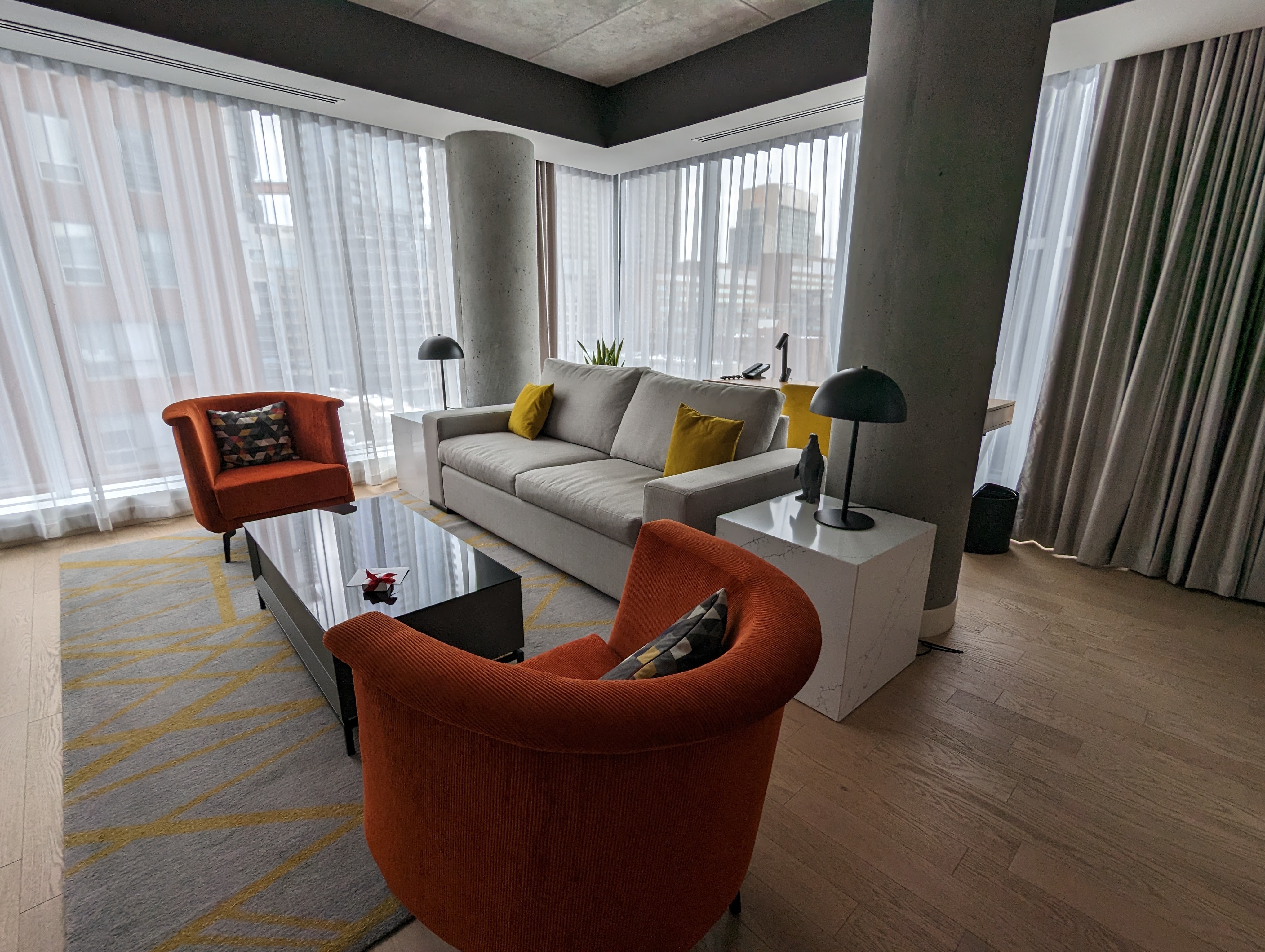 Nous avons finalement reçu un appel à 14h nous informant que notre suite était prête. À notre retour, nous sommes brièvement passés par la réception pour prendre possession des clés de la suite 1102, puis nous sommes immédiatement montés au 11e étage.