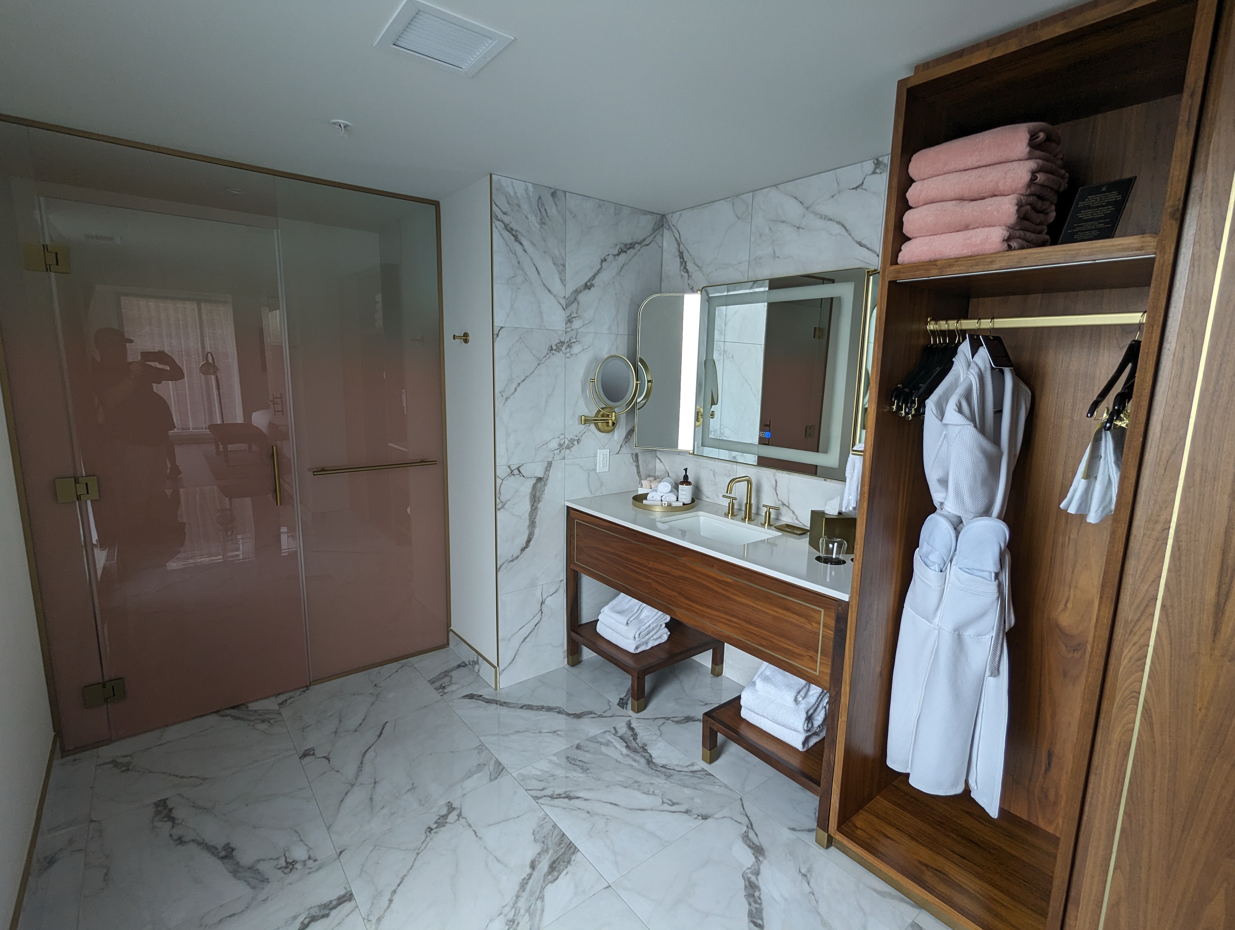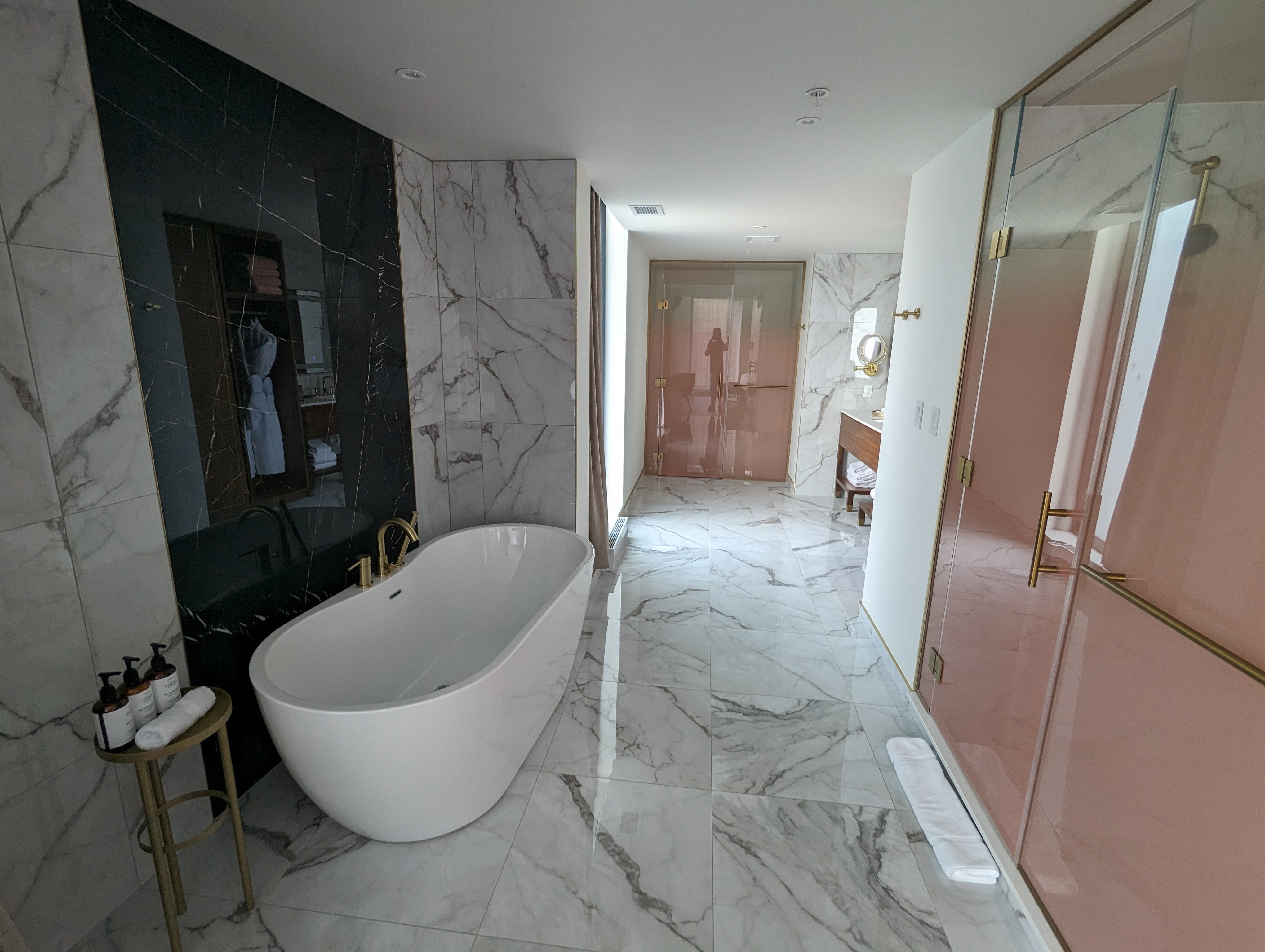 Dans l’autre zone, où le plancher est fait tout en marbre, j’ai eu la surprise de découvrir la douche fenestrée sur trois faces (!!!) avec sa robinetterie (douche téléphone et douche à effet de pluie) dorée, ainsi qu’une baignoire. Confession: j’ai pris trois douches au cours de notre séjour et j’aurais chaque fois pu y passer une heure tellement la pression était bonne, que l’eau chaude était au rendez-vous et que les produits disponibles sentaient le ciel!
