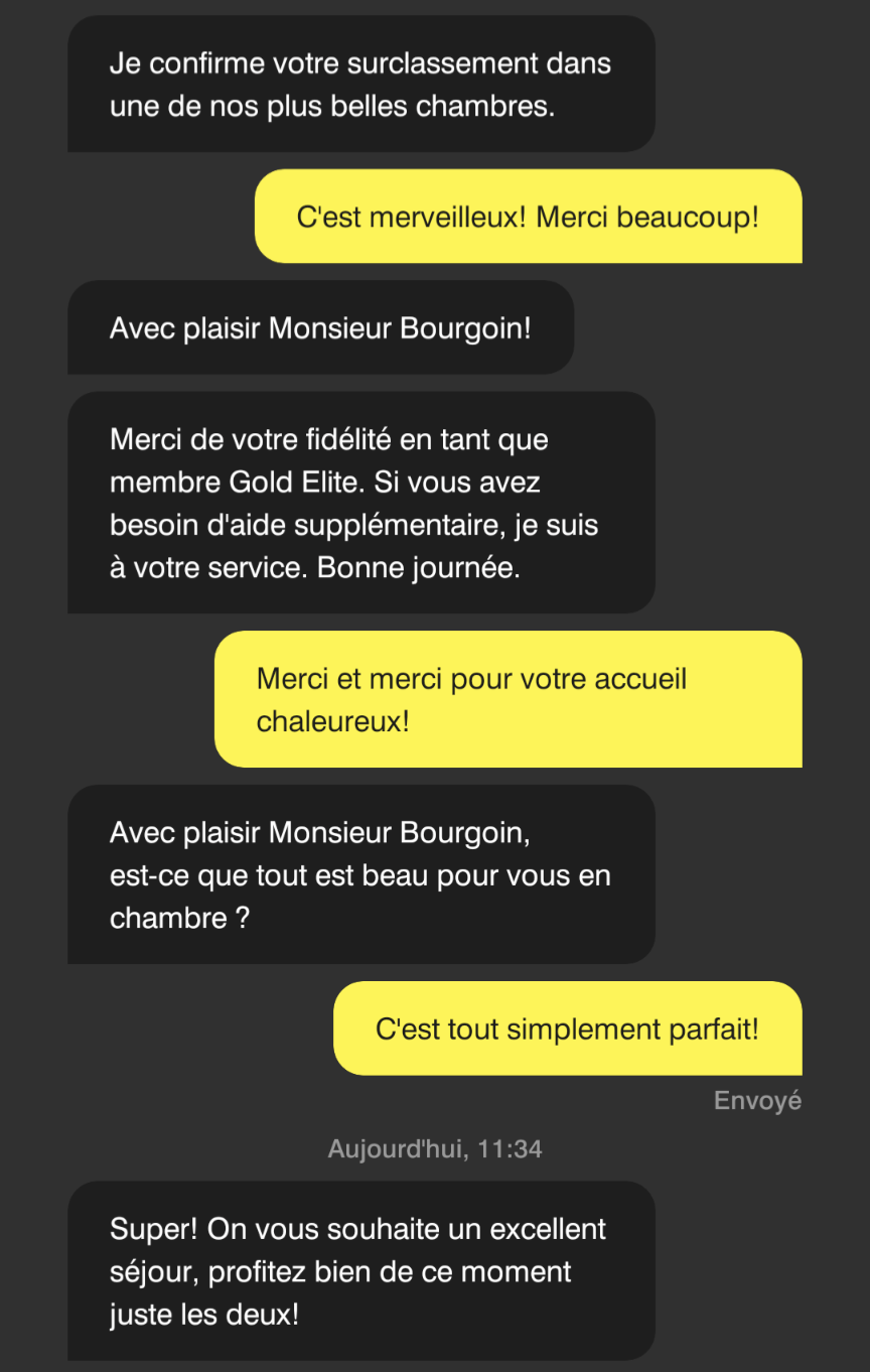 Le samedi matin, quelques heures avant notre arrivée, j’ai de nouveau utilisé le clavardage pour m’informer si l’hôtel serait en mesure de nous surclasser sur la base de mon statut Gold Marriott BonVoy. On m’a tout d’abord répondu qu’une vérification serait faite à cet effet, puis on m’a finalement récrit, un peu plus tard, pour me confirmer que nous avions obtenu un surclassement dans «l’une des plus belles chambres» de l’hôtel. Comme c’était excitant!