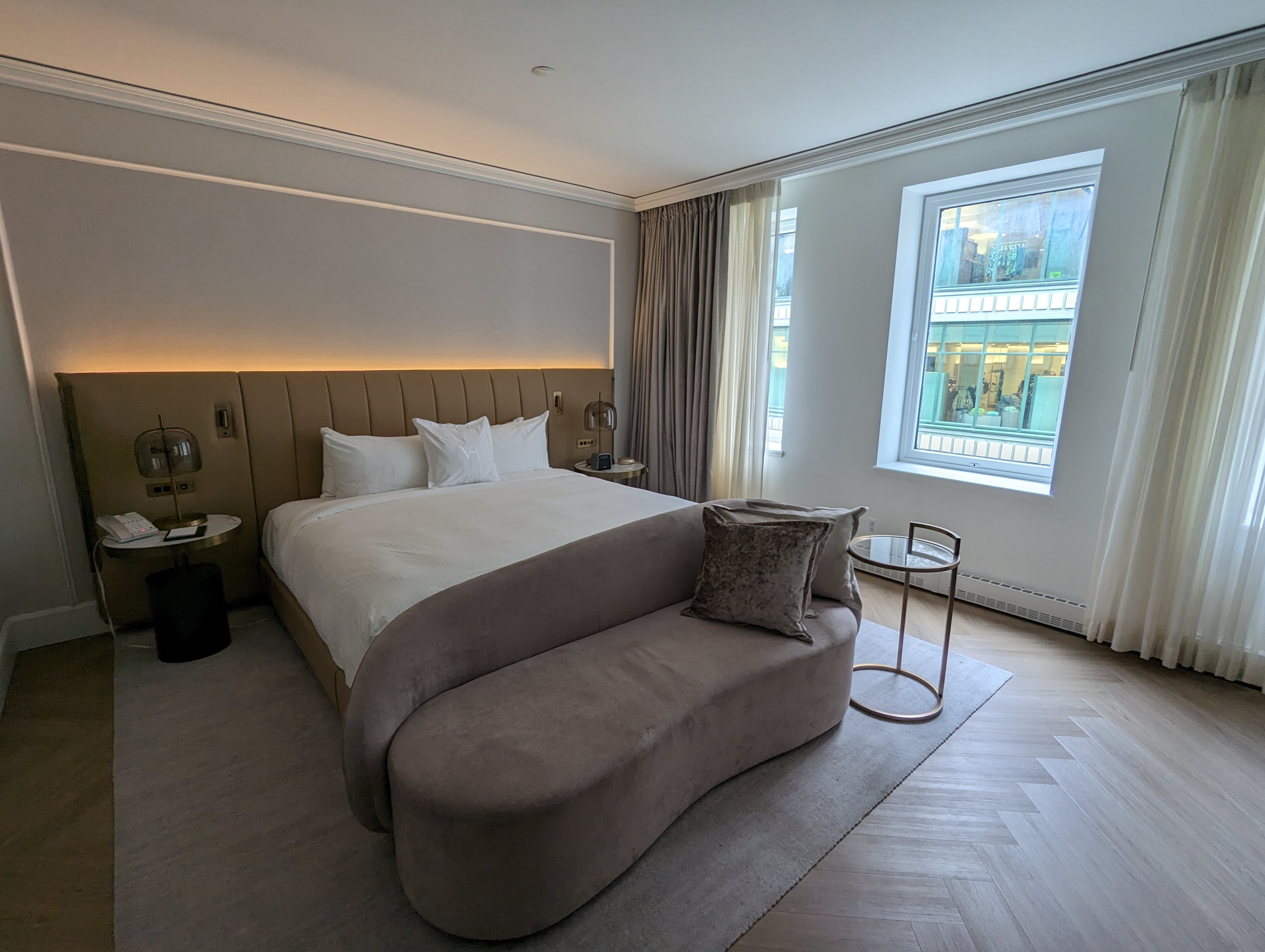 Nous avons eu la surprise de découvrir une chambre très lumineuse avec trois grandes fenêtres donnant sur la rue De la Montagne, face au Holt Renfrew Ogilvy. La pièce, de grande dimension, était occupée par le lit ainsi, qu’à son pied, un divan avec deux coussins qui s’est avéré un peu plus raide que ce qu’il laissait présager. Face au lit se trouvait un très grand miroir au milieu duquel se trouvait le téléviseur intelligent. À gauche de ce dernier, le «magasin général» avec non seulement des bouteilles d’alcool fort, mais aussi des grignotines comme des noix, des bonbons ou des M&M. La traditionnelle machine Nespresso et une bonne quantité de tout ce qu’il faut (capsules, sucre et coffee mate) venaient compléter le tout. Le mini-bar, bien garni, était juste dessous, dissimulé dans le meuble.