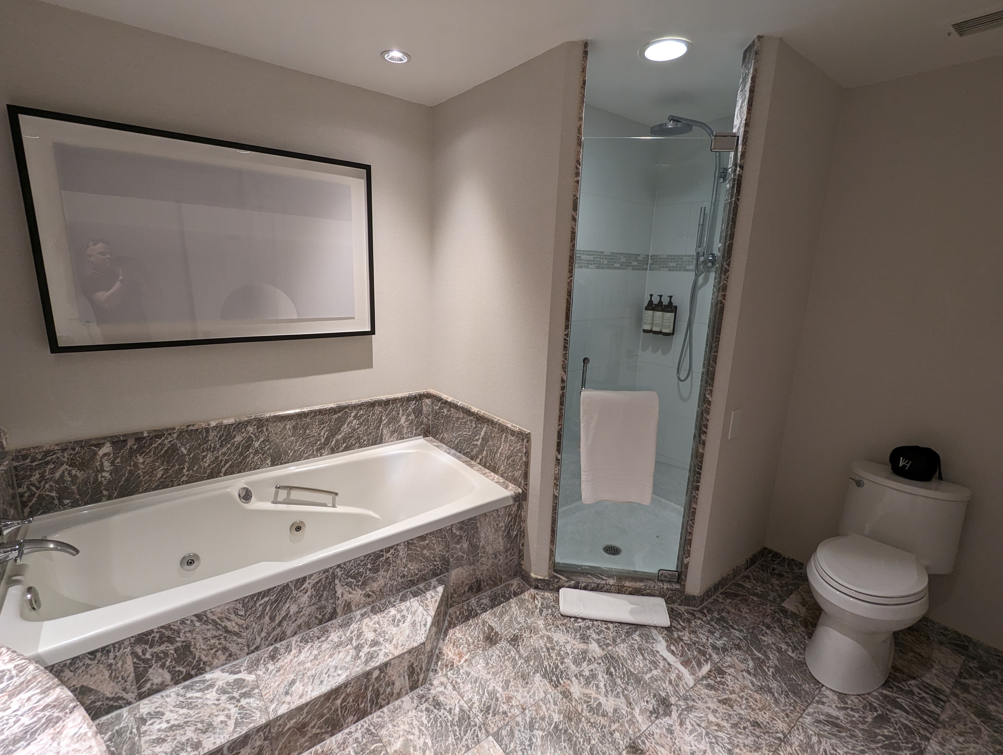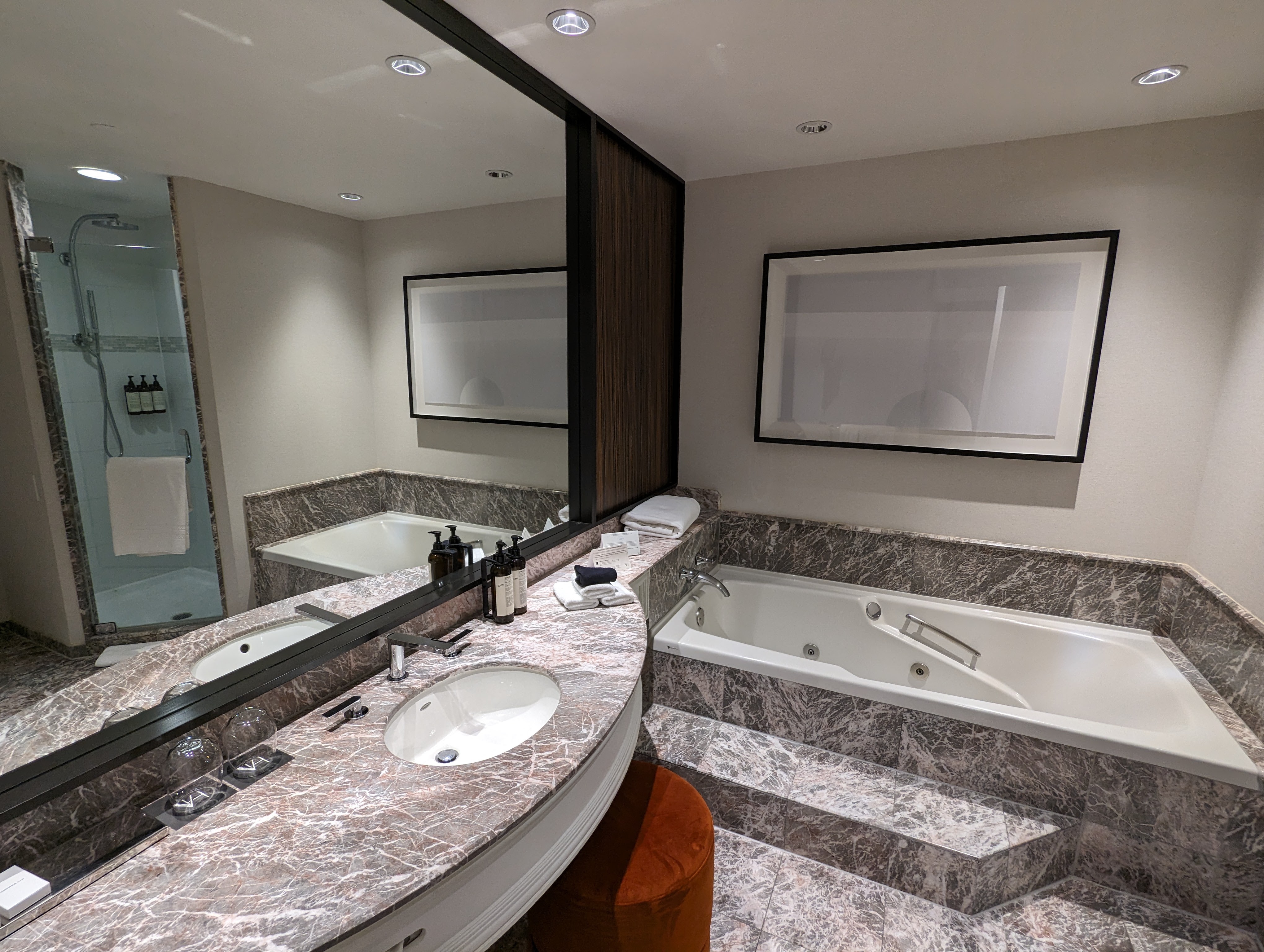 Fait plus rare dans les hôtel que j’ai eu la chance de visiter, la salle de bain en marbre était non seulement équipée d’une douche, mais également d’un bain à remous. Les produits, fournis dans des distributeurs, sentaient très bon.