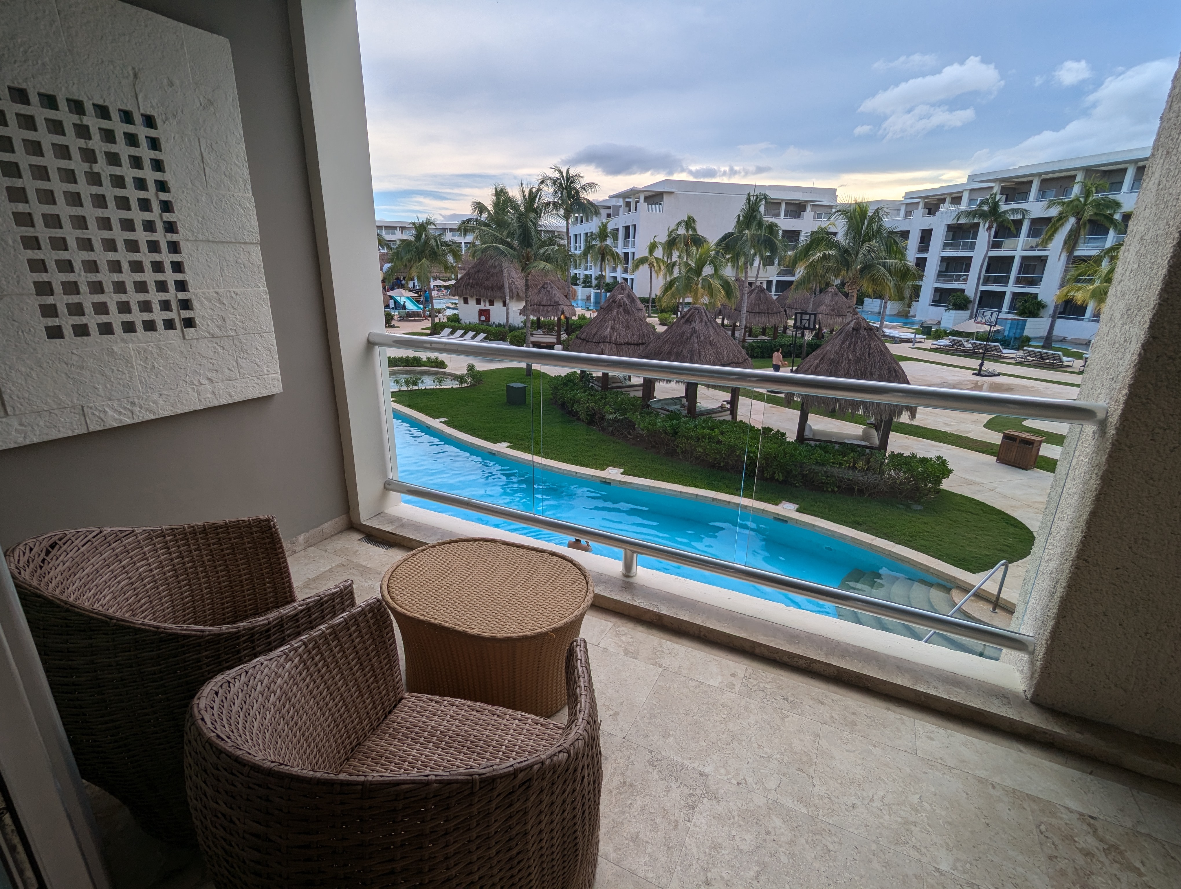 Pour ce séjour, nous avions choisi la chambre de base, soit la suite junior vue nature. Nous avons finalement hérité d’une suite dont le balcon offrait une superbe vue sur la cour intérieure et les piscines. Alors que les chambres du premier étage offre un accès direct à la piscine, notre suite était plutôt située au deuxième étage de l’immeuble qui en comptait quatre.