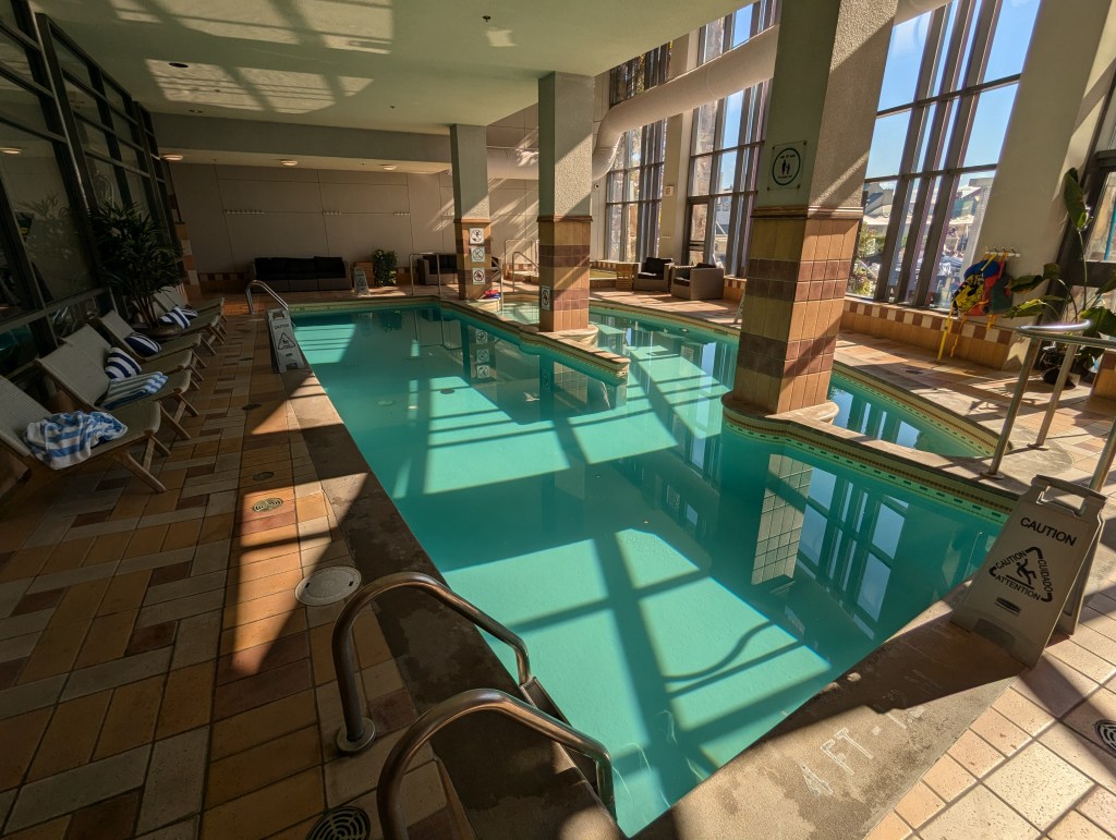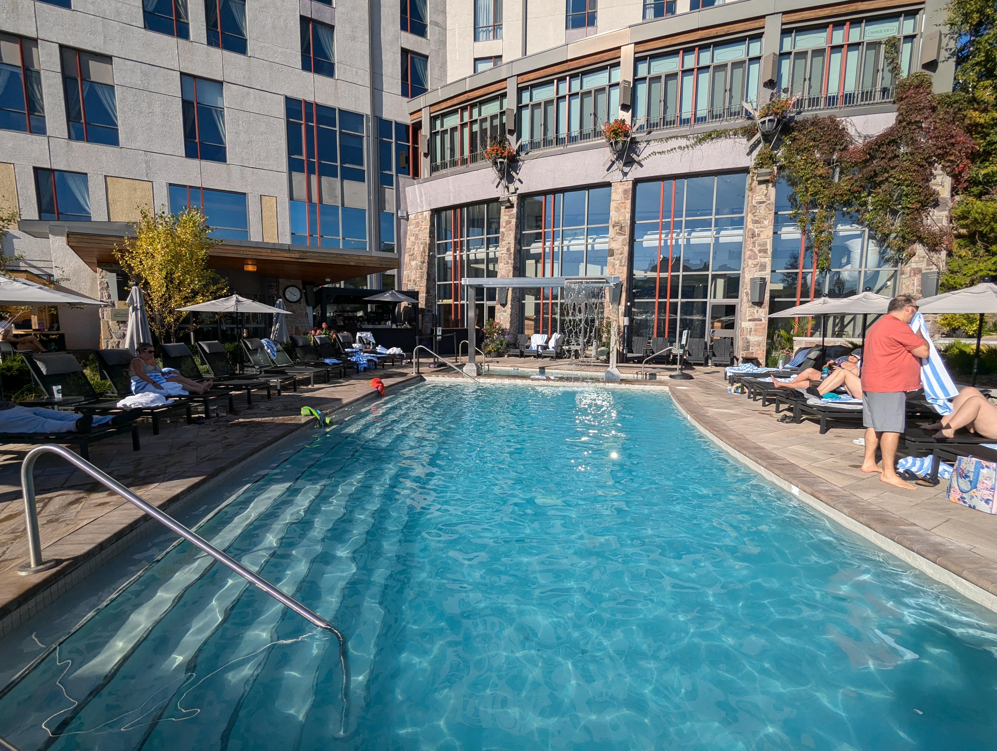 Alors qu’il faisait particulièrement chaud en cette fin de septembre, nous avons passé une partie de l’après-midi à la piscine extérieure de l’hôtel qui donne vue sur le bas des pentes et le village piétonnier. La température de l’eau était confortable et il y avait une bonne quantité de chaises longues et de parasols autour de la piscine.