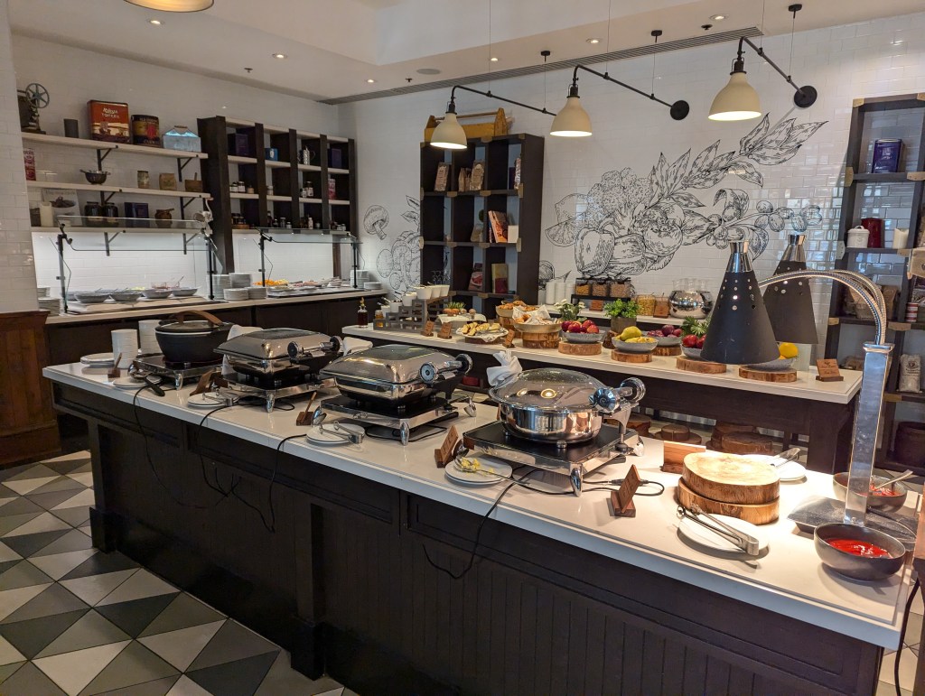 On nous a assigné une table au bord de la fenêtre et notre serveur, Patrick, est rapidement venu nous offrir café et jus d’orange et nous demander si nous options pour la formule buffet ou à la carte. Dans le cas qui nous concerne, le buffet nous était offert gratuitement et on parle ici d’un buffet de grande qualité!