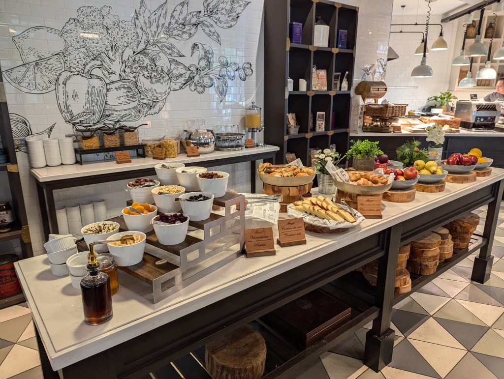 Une cheffe cuisinière était disponible pour cuire des omelettes et des œufs au goût des clients et notre serveur nous a informés que si nous voulions des œufs pochés, nous n’avions qu’à lui en faire la demande. Il y avait également une sélection de pains, viennoiseries, fruits (frais et séchés), céréales, fromages, charcuteries, en plus des classiques comme les œufs brouillés, le bacon, les saucisses et les pommes de terre. Une station sucrée, avec des gaufres et des crêpes françaises, était également disponible.
