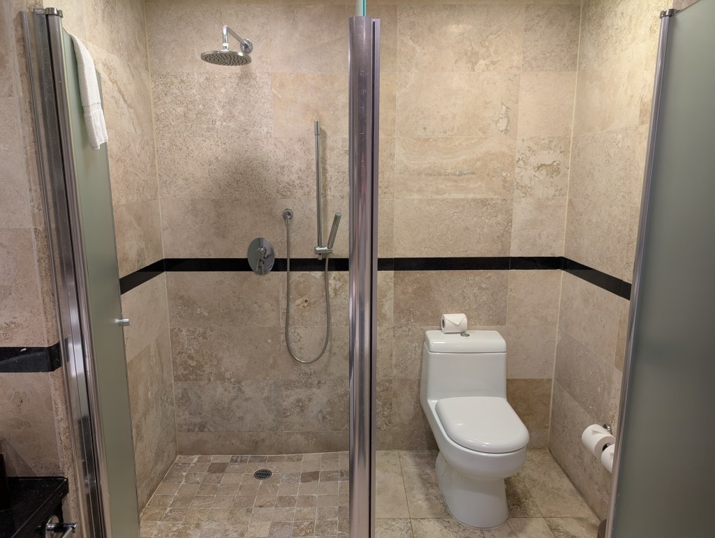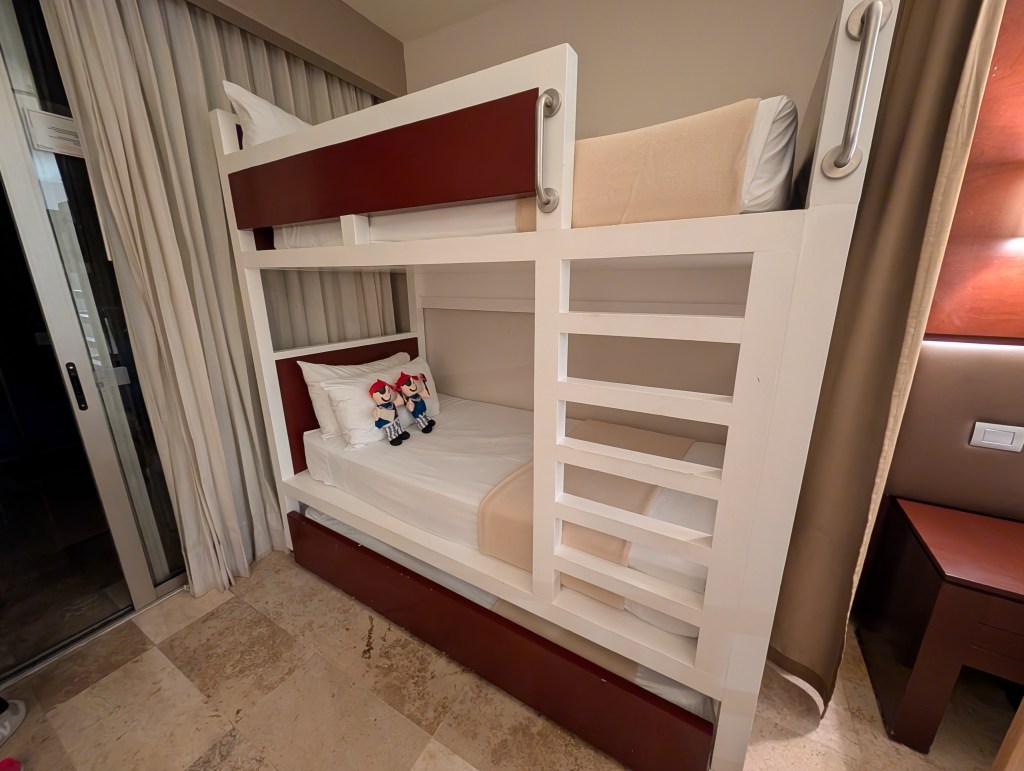 Pour ce séjour, nous avons opté pour une «suite junior deluxe» avec un très grand lit («king) et deux lits superposés. Nous avons également ajouté l’option de l’accès à la piscine depuis la chambre, communément appelé «swim out». Nous n’avions jamais eu une chambre avec cet aménagement dans le passé, mais considérant le coût plus qu’abordable (300$ pour la semaine), nous avons choisi d’en faire l’essai. La salle de bain était quant à elle équipée d’une grande baignoire à remous, d’une douche en céramique avec deux pommeaux (à effet de pluie et douchette), de deux lavabos, ainsi que d’une toilette séparée.