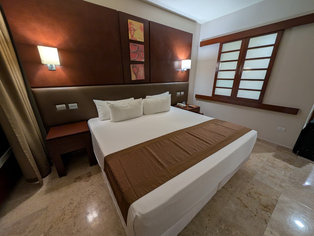 Arrivés à Cancun en fin de soirée (après un retard de 11 heures de notre vol!!!), environ une heure a été nécessaire pour débarquer de l’avion, franchir la douane et récupérer nos valises avant de monter dans l’autobus qui allait nous amener à l’hôtel. Coup de chance, notre hôtel était le premier arrêt, ce qui fait qu’il a fallu seulement une trentaine de minutes pour y arriver. Nous avons ensuite rapidement été enregistrés, puis amenés à notre chambre.