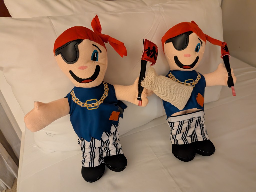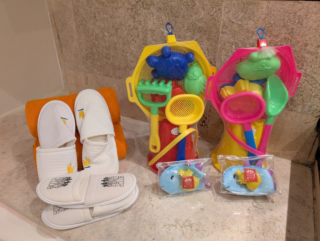 Dès notre arrivée à la chambre, nous avons pu constater les petits plus de la section Family Club. Plusieurs petites attentions avaient été faites pour les enfants : deux toutous pirates, deux ensembles de jouets pour le sable, ainsi que deux ensembles (gant de toilette et savon) pour le bain. Nos enfants étaient très excités de découvrir tout ça, malgré le fait qu’ils étaient réveillés depuis presque 24 heures lorsque nous sommes arrivés à l’hôtel. Ce qui a de vraiment chouette, c’est que tous ces petits cadeaux pouvaient être ramenés à la maison ; ça fait donc de beaux souvenirs. Les parents n’étaient pas en reste : un sac de plage et une petite bouteille d’alcool nous attendaient sur le bureau. Il y avait également de petites pantoufles et des robes de chambre pour les enfants. Même le mini bar de la chambre était pensé pour toute la famille: on y trouvait des boissons gazeuses, des bières locales, ainsi que du lait et du lait au chocolat en boîte.