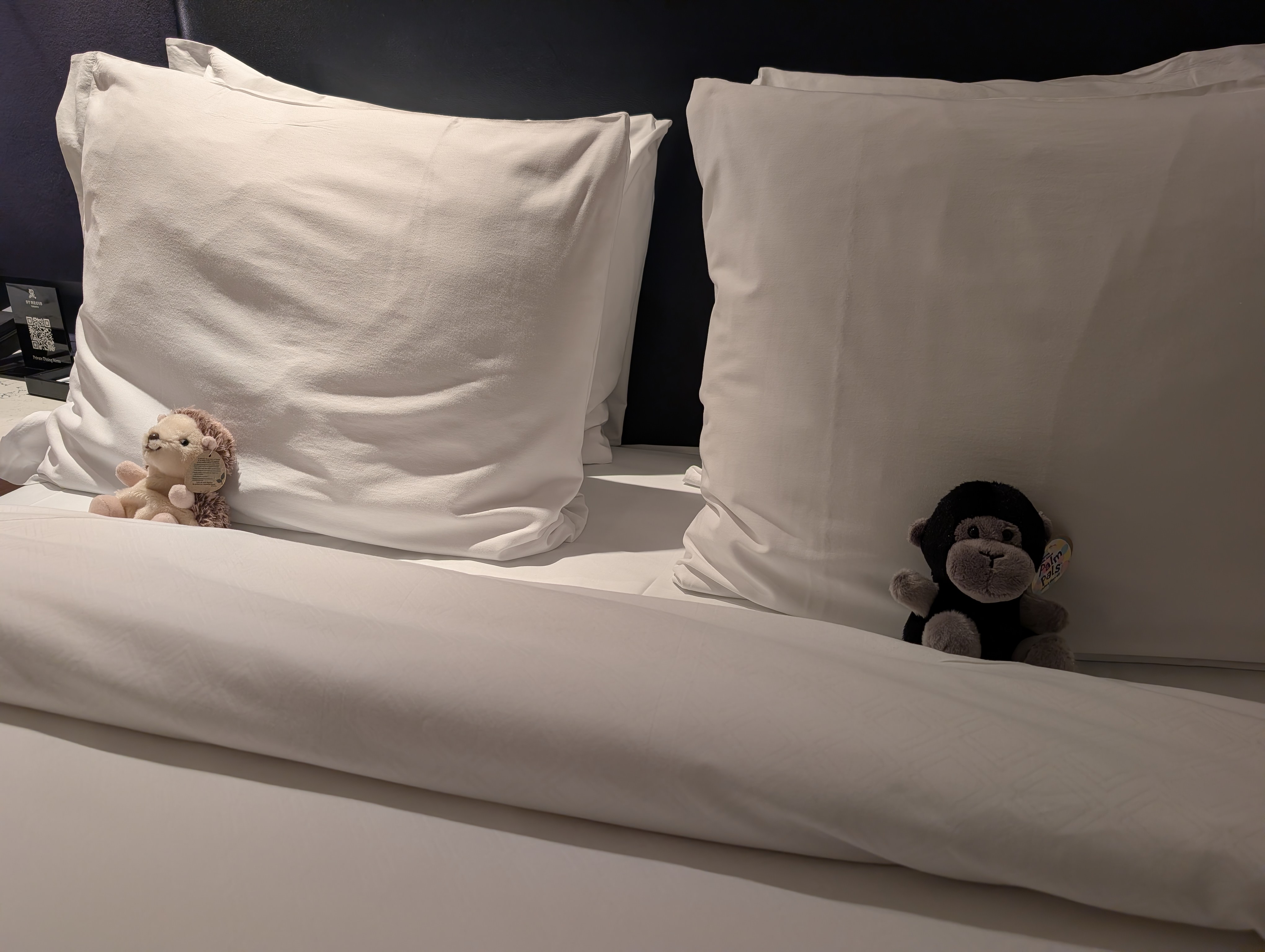 Dès notre entrée dans la chambre, la famille a été heureuse de constater toutes les petites surprises organisées par l’hôtel : la bannière d’anniversaire était installée et occupait toute la longueur de la fenêtre, un petit gâteau d’anniversaire, de même qu’une note de bienvenue et l’ensemble de maison en pain d’épice étaient disposés sur la table et deux petits toutous (un singe et un hérisson) attendaient les enfants sur l’un des lits. Toutes ces petites attentions ont été d’un précieux réconfort après notre journée difficile et ont fait en sorte que notre séjour commence du bon pied.