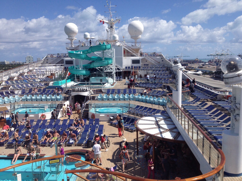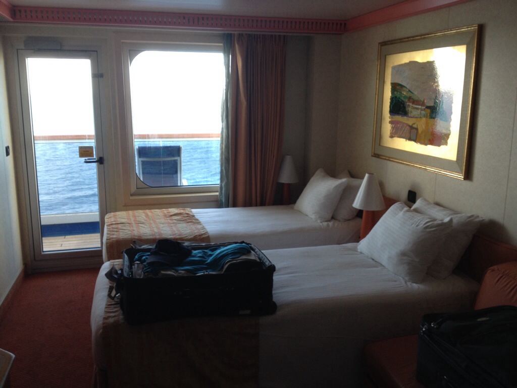 C’est finalement ce midi que mon père et moi avons eu la chance de monter à bord du Carnival Conquest. Alors que le départ n’était prévu que pour 16h, nous avons pris le temps de faire le tour de cette véritable ville flottante pour se familiariser avec notre univers de la prochaine semaine: deux piscines, nombreux restaurants et bars, spa, gymnase, boutiques… Tout y est! Notre cabine se trouve quant à elle sur le septième pont, environ au milieu du navire.
