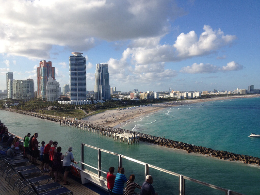 Après nous avoir fait languir pendant 30 minutes pour un exercice d’évacuation, c’est à 16h45 qu’a afin retenti le sifflet marquant le départ. Les centaines de passagers (le Conquest en compte tout près de 3000) massés près des balustrades, le navire s’est lentement mis à avancer. Pendant les 25 minutes qu’il a fallu pour quitter le port de Miami, des dizaines de personnes ou sur l’eau ou massés sur la côte nous envoyaient la main. On se sentait presque dans le film Titanic à saluer des gens qu’on ne connaît pas.