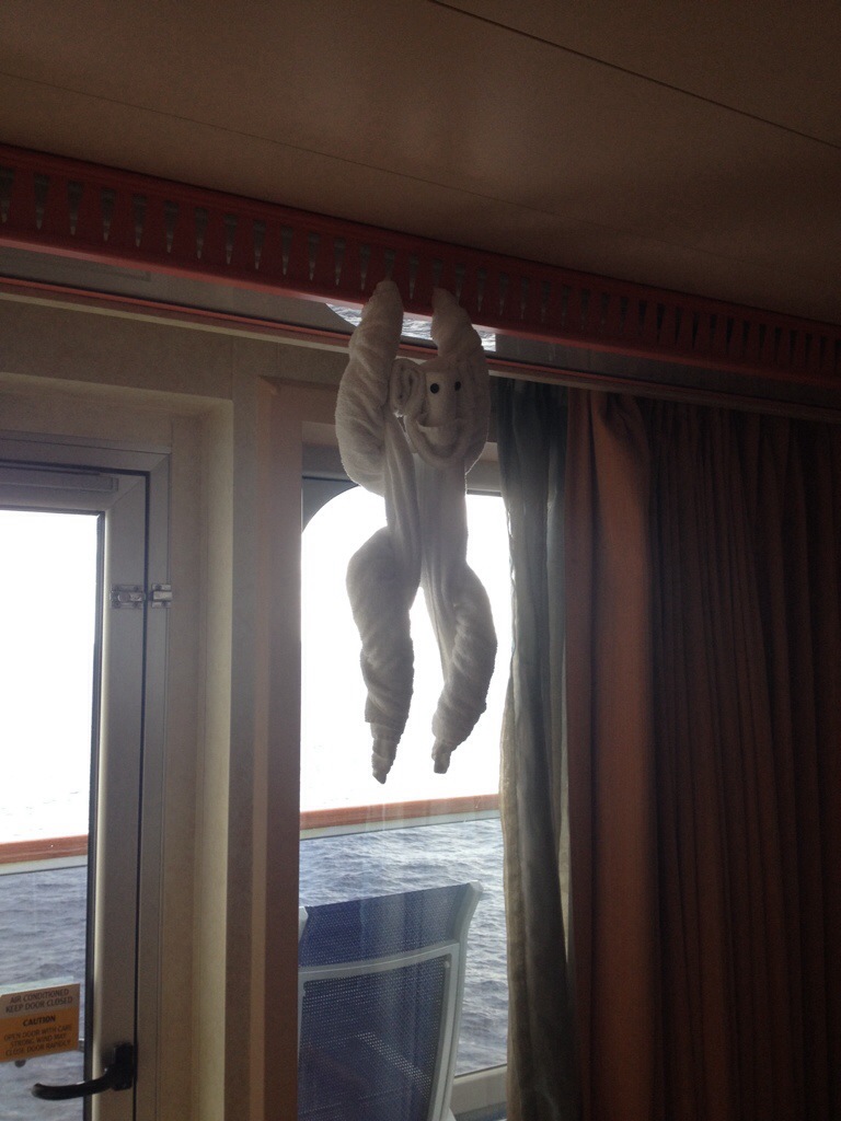 Il y a tout d’abord Gede, de l’Indonésie, valeureux steward. Travaillant chaque jour de 8h à environ 22h, il veille au confort et à la propreté de votre cabine. Le matin, il fait votre lit, nettoie, remplace les serviettes. Le soir, il passe défaire votre lit pour la nuit, allume les lampes de chevet, dépose le programme du lendemain et deux petits chocolats sur le lit, installe un animal fabriqué de serviettes (comme ce singe suspendu à la pôle à rideau)… Mais par dessus tout, Gede se fait un plaisir de vous saluer par votre prénom et de vous demander comment se passe votre journée chaque fois que vous le croisez. En souriant. Toujours.