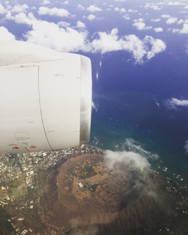 Lorsque notre avion a commencé à survoler l’archipel d’Hawaï, en fin de journée hier, à peine quelques nuages flottait au-dessus d’Oahu. Les rayons du soleil rendaient l’eau turquoise et j’ai même eu droit, par mon hublot, à une superbe vue en plongée de Diamond Head qui m’a ébloui.